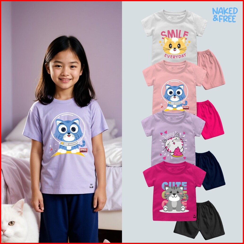 Naked Free Setelan Pendek Bayi Dan Anak Perempuan Animal Series Kittie Cat Smile Bahan Katun 30s