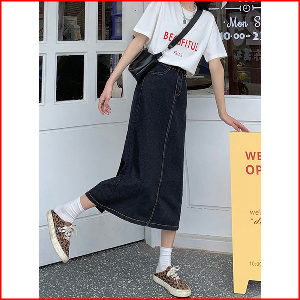 Midi Rok Jeans Highwaist Wanita Korea Style Skirt Kasual Denim Rok
