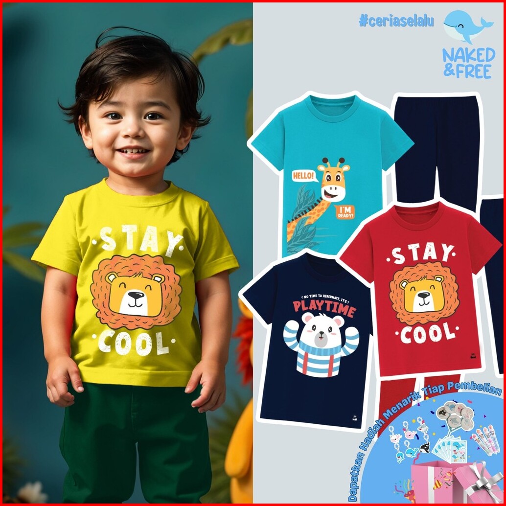 Naked Free Kaos Piyama Pendek Anak Laki-laki Animal Series Play Time Bahan Katun 30s Ani-1