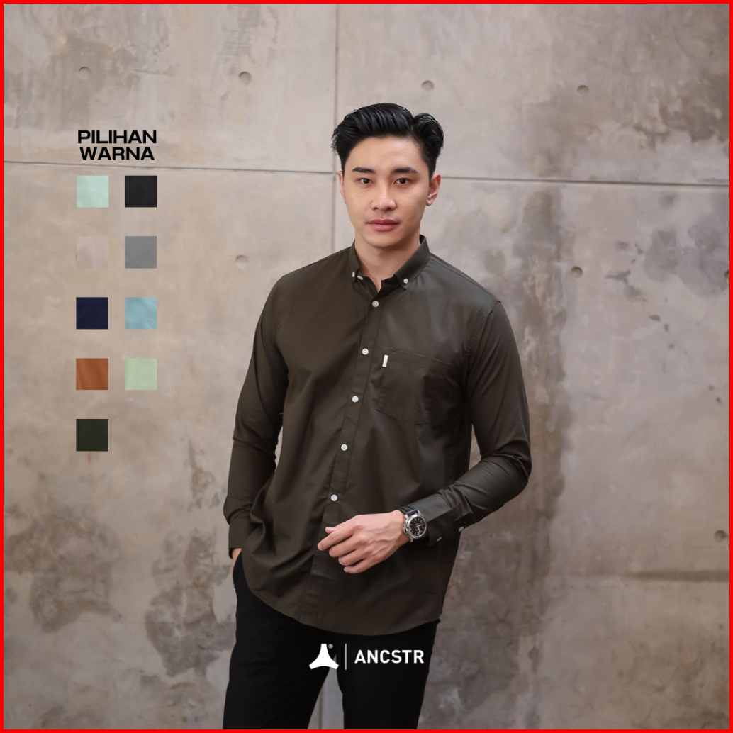 Ancstr Kemeja Kerah Kancing Saku Pria Lengan Panjang Katun - Formal Collar