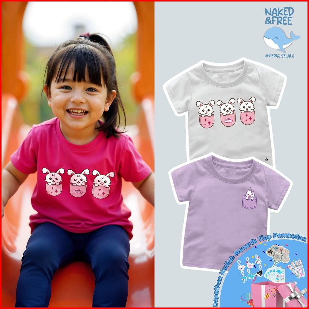 Naked Free Baju Kaos Anak Perempuan Pocket Series Bunny And Unicorn Bahan Katun 30s Poc-1