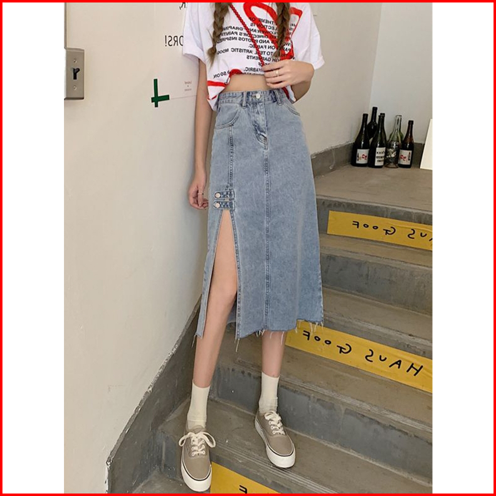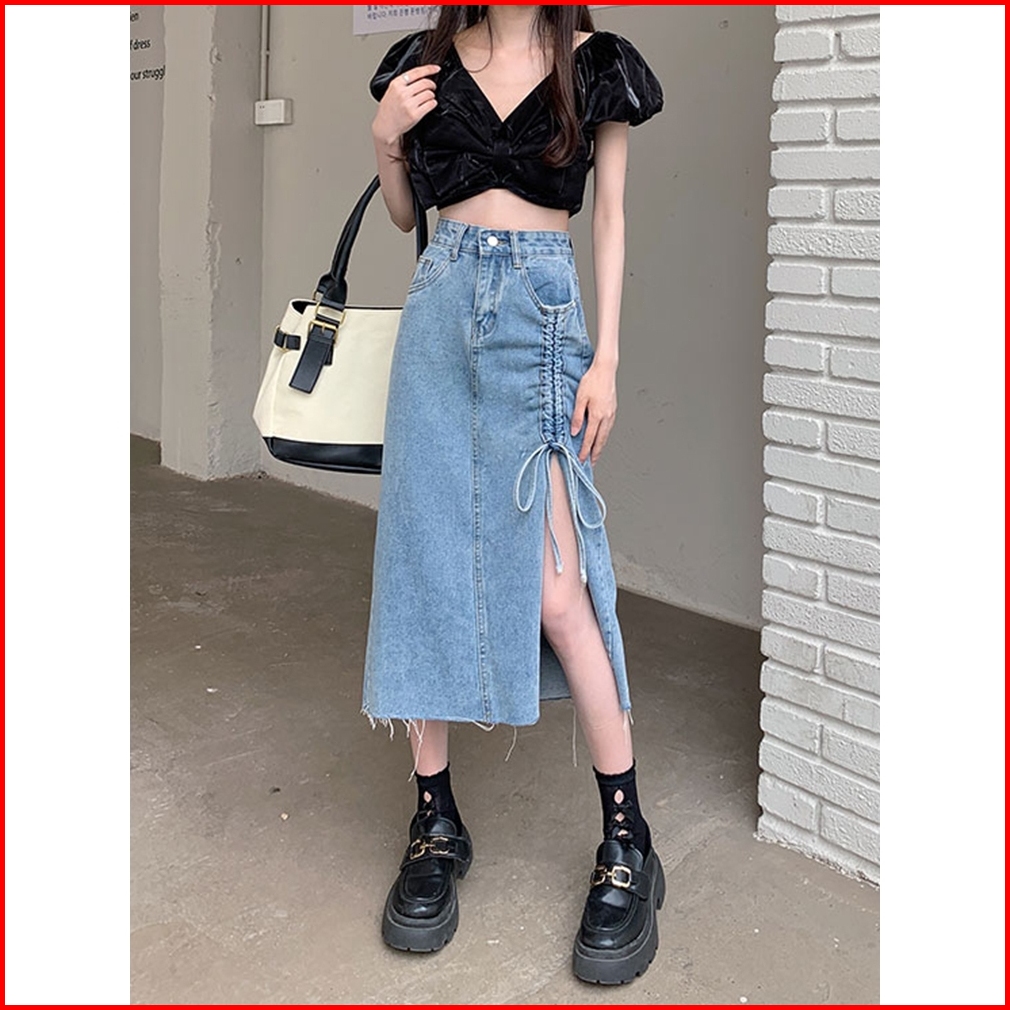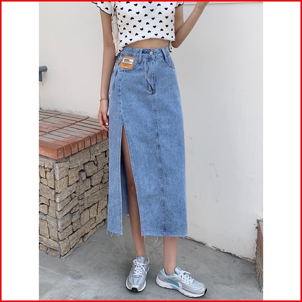 Rok Midi Denim Fashion Rok A-line Highwaist Rok Jeans Wanita Korean