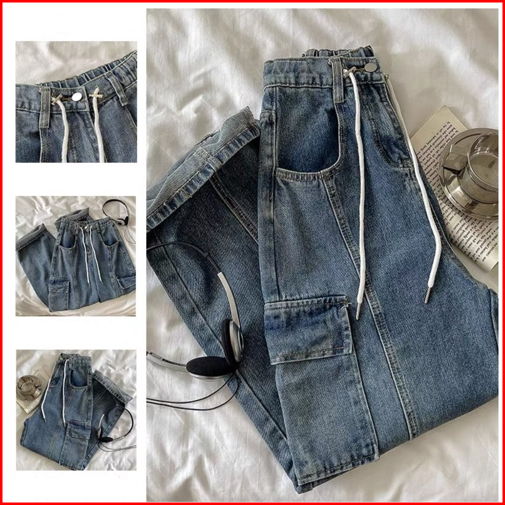 Putih Krem Highwaist Cargo Celana Jeans Street Style Korean Jeans Cargo Highwaist Loose Straight Panjang Celana Jeans