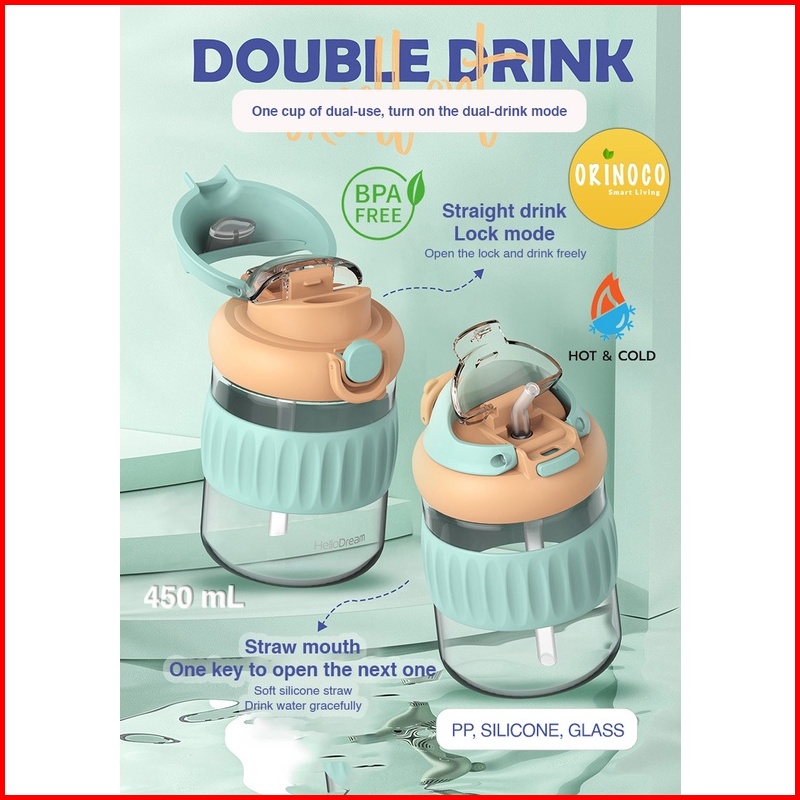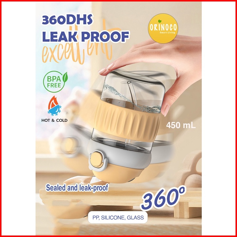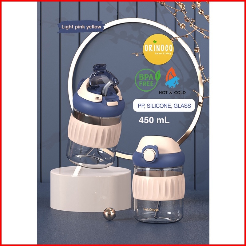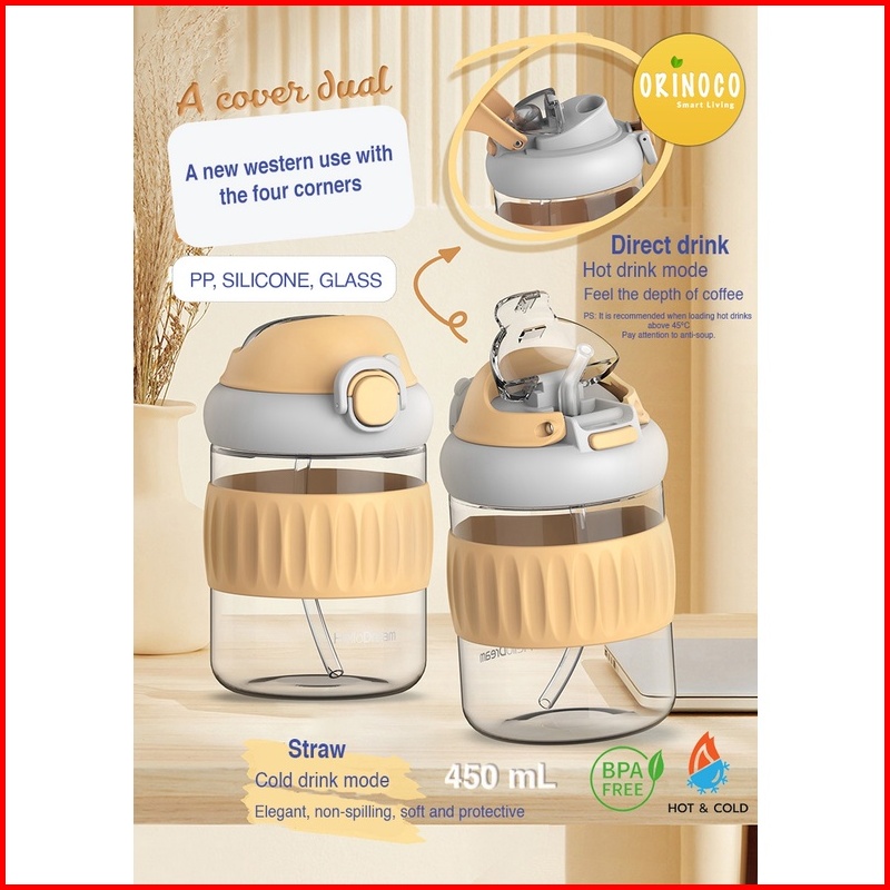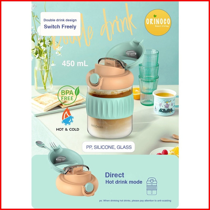 Orinoco Botol Kaca Dual Drink 450 Ml Hot Cold H-6342 With Silicone Case Anti Slip Botol Kaca Include Sedotan Silikon Ant