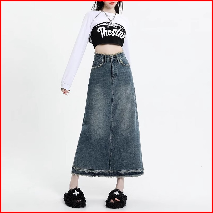 Rok Retro Denim A-line Premium Biru Rok Jeans Midi Wanita Korean Highwaist Panjang