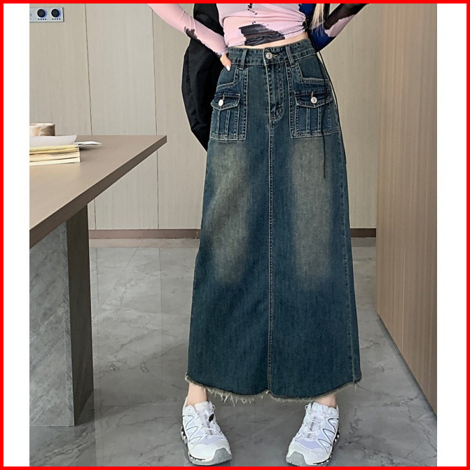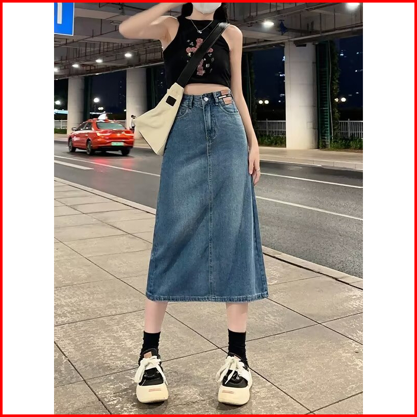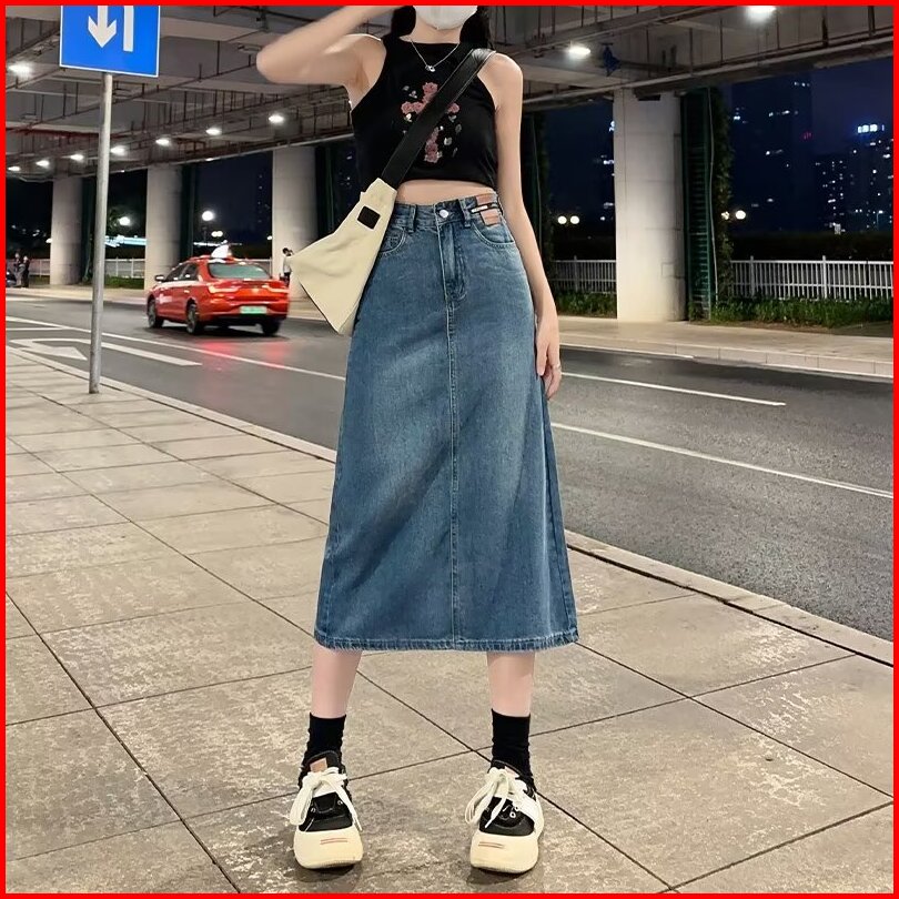 Highwaist Korean Style 3 4 A-line Premium Biru Kasual Midi Rok Jeans Denim Wanita