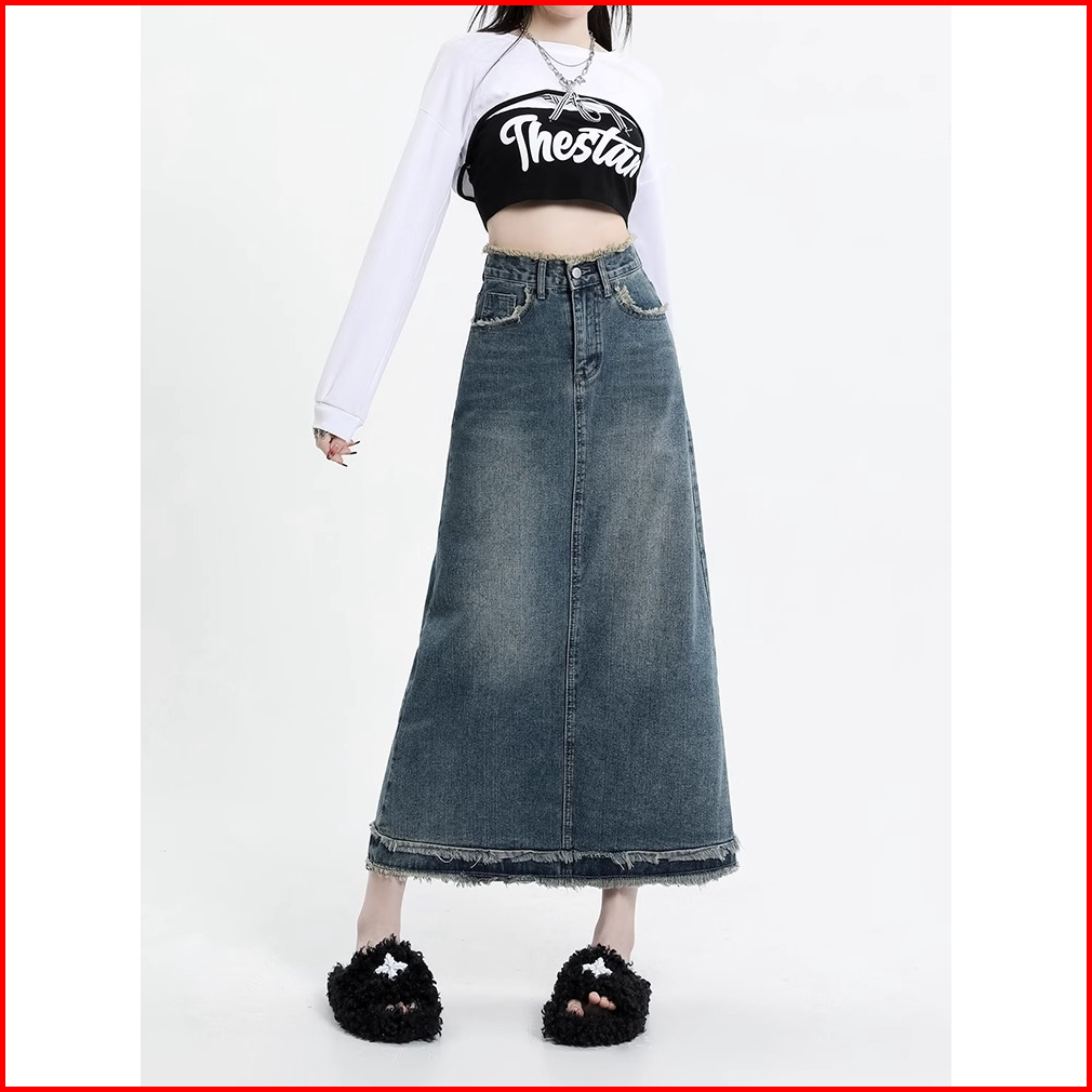Korea Style High Waist Rok Denim A-line Midi Rok Jeans Wanita