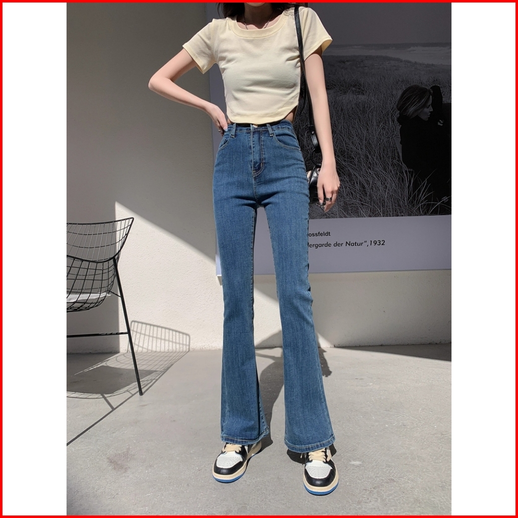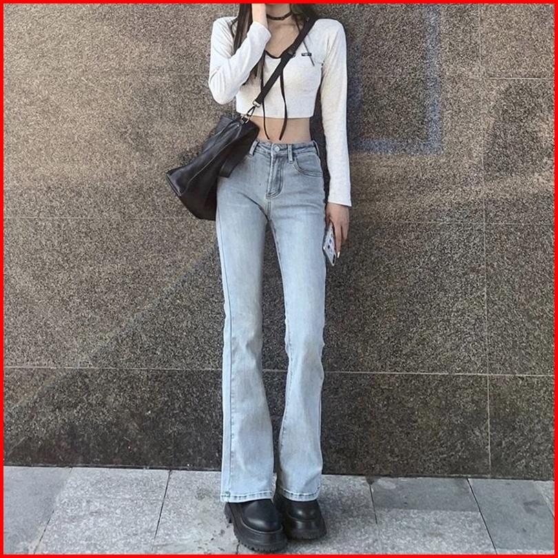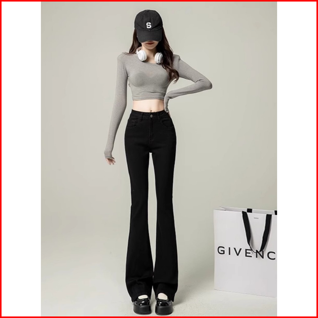 Hitam Highwaist Stretch Cutbray Celana Jeans Panjang Wanita Korea Flare Jeans