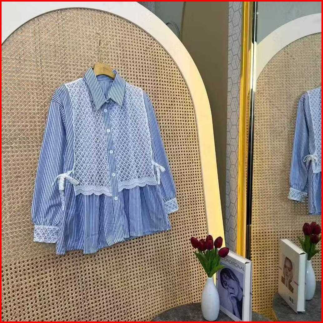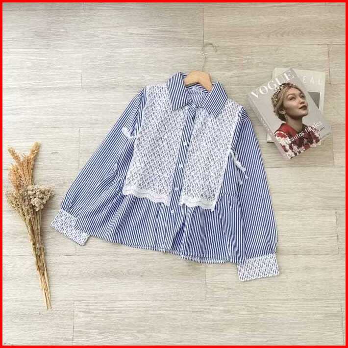 Arumi Blouse Salur Kombinasi Brukat Motif Stripe Kemeja Tangan Panjang