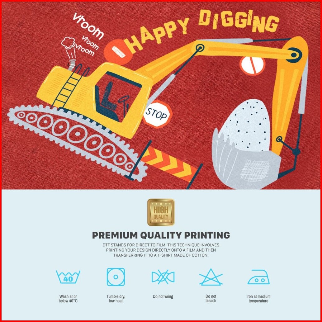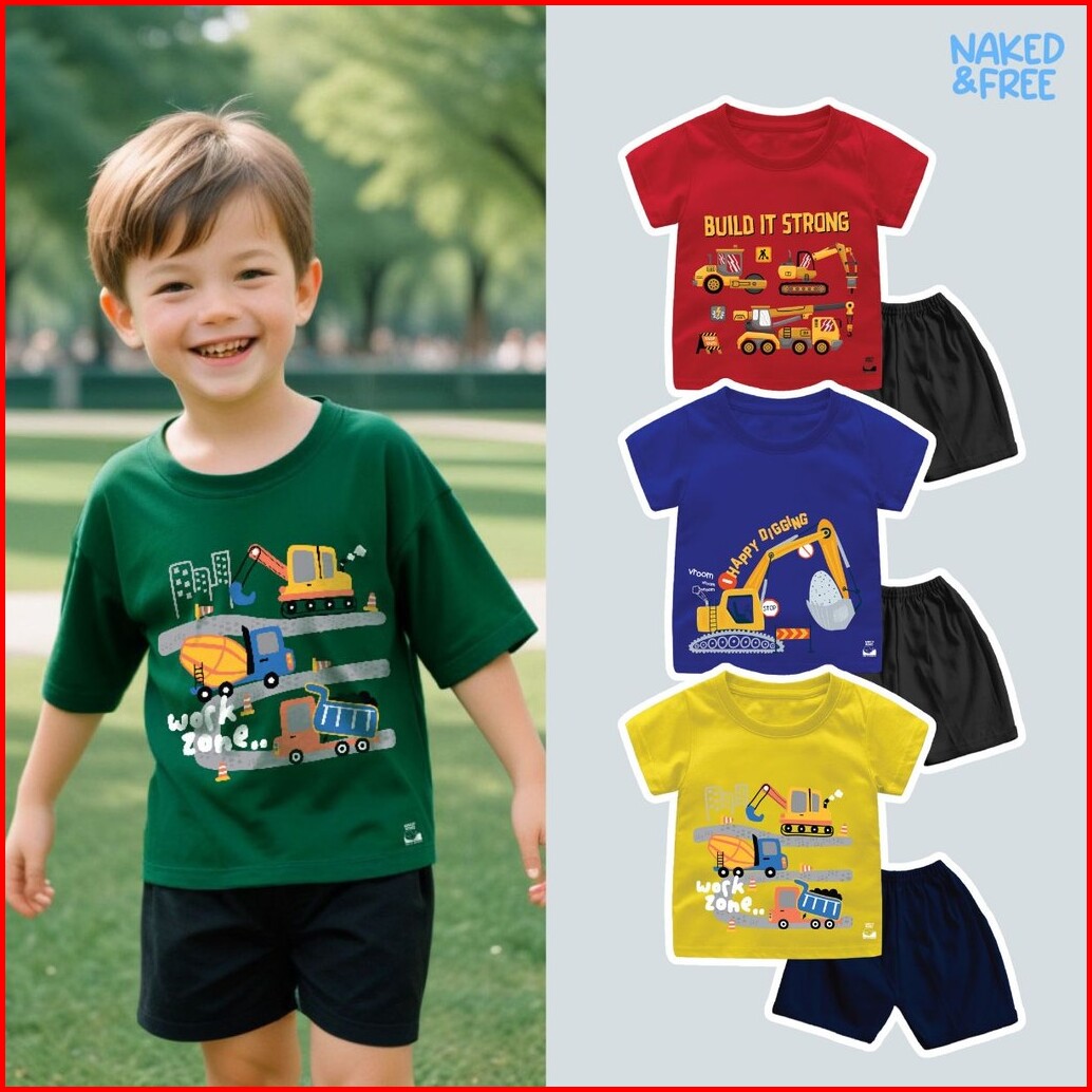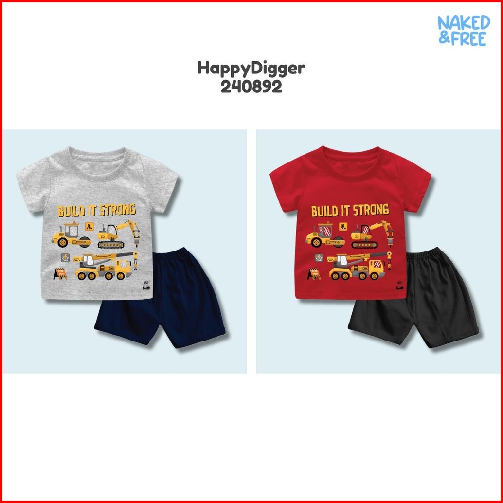 Naked Free Setelan Pendek Bayi Anak Laki-laki Excavator Series Happy Work Digger Bahan Katun 30s