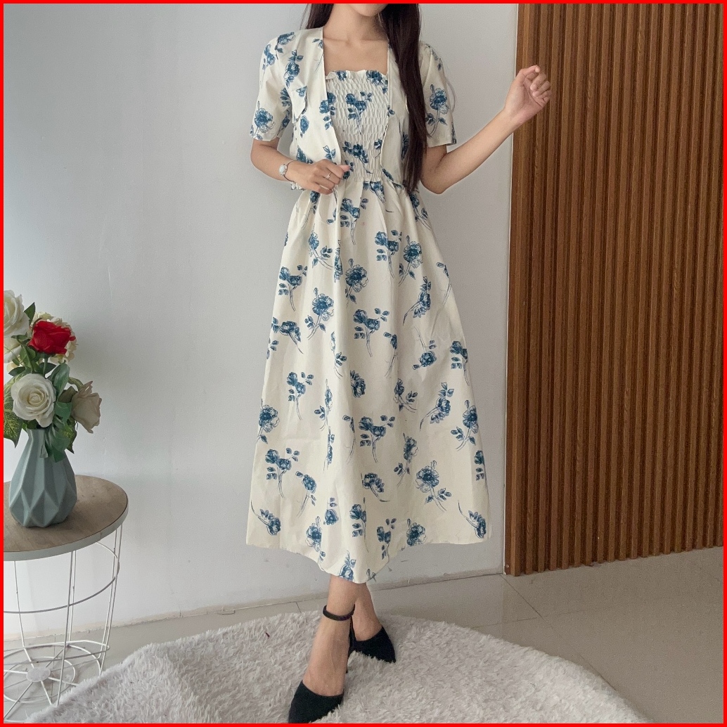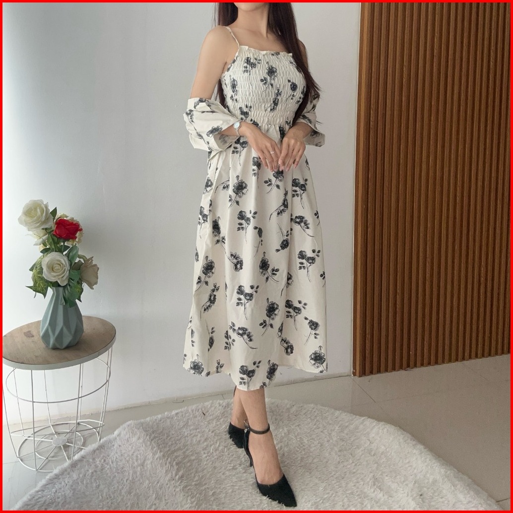 Rx Fashion - 2 In 1 Set Viana Motif Bunga Setelan Wanita Baju Casual Outer Katun Dress Panjang Nyaman Variasi Flowy -pn