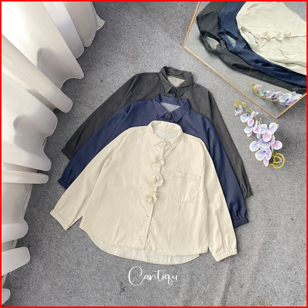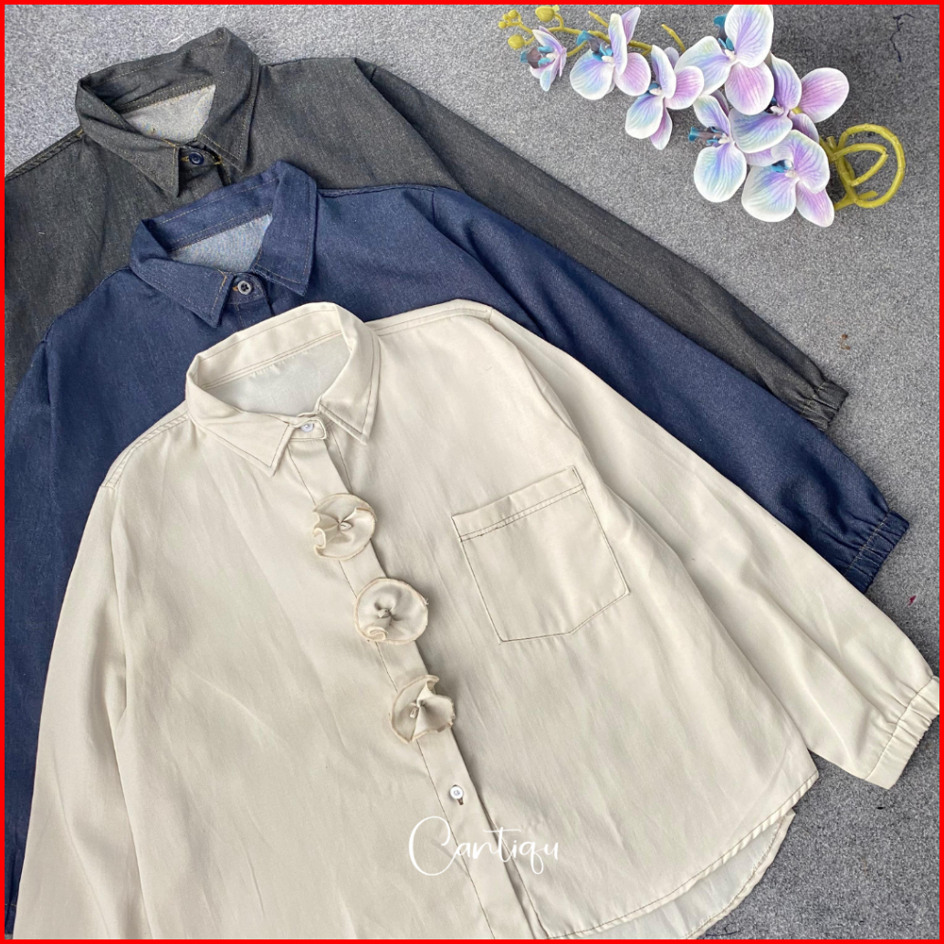 Cantiqu - Camelia Blouse Soft Jeans Kemeja Kancing Aksen Bungan Lengan Panjang