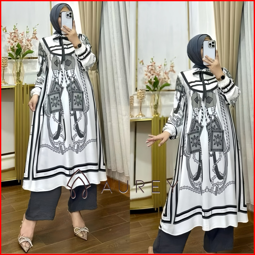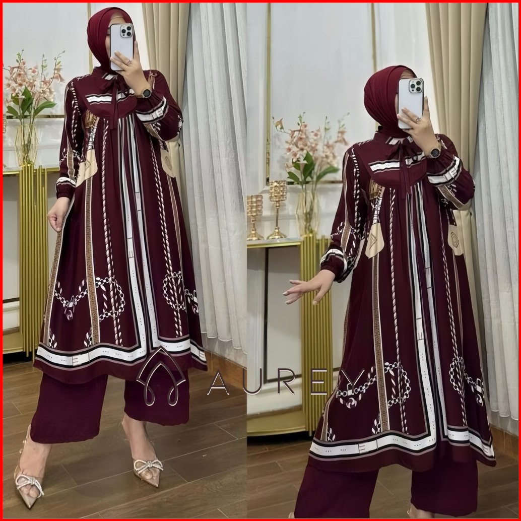 Aurey Setelan Long Tunik Wanita Oneset Tunik Rayon Valencia Setelan Tunik Panjang 4 Warna Set Celana