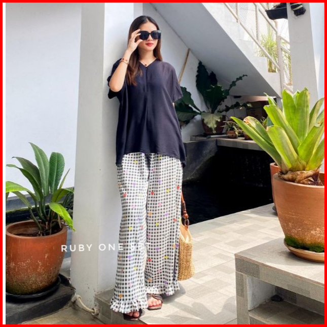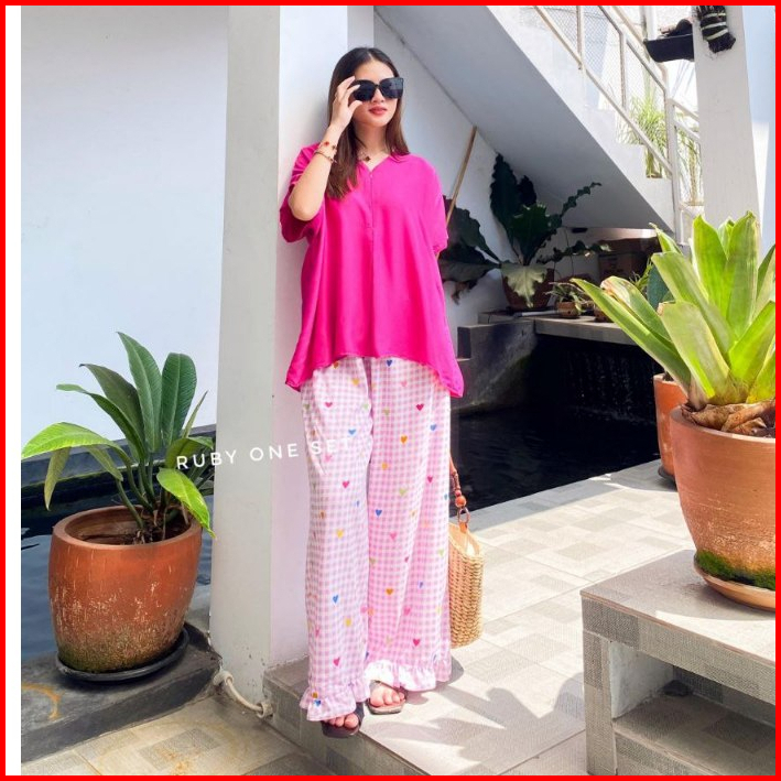 Ruby One Set Daily Pajamas Kekinian Baju Wanita Tangan Pendek Atasan Celana Panjang Rayon Twill