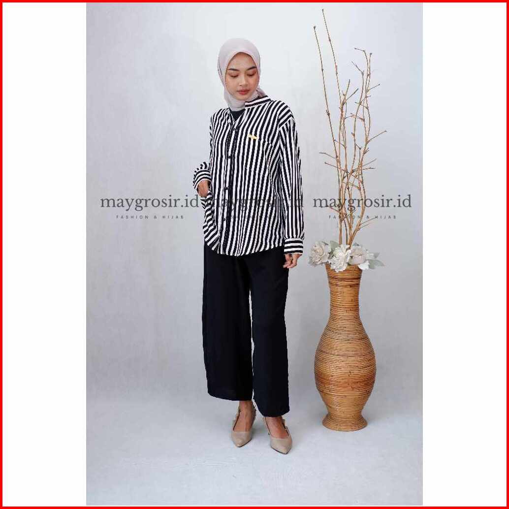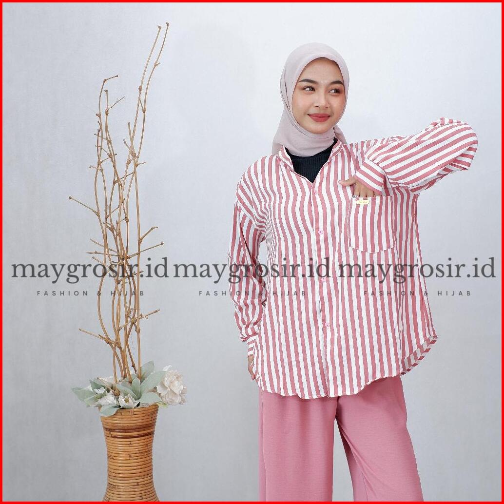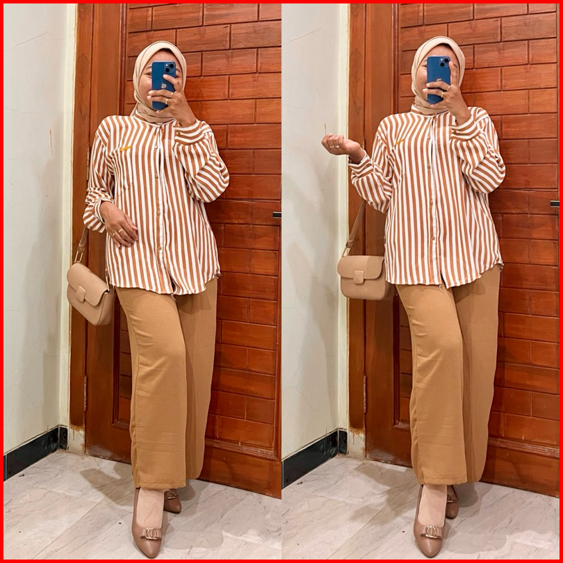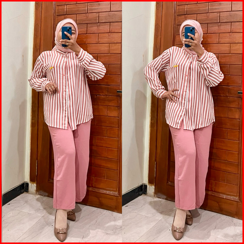 Maygrosir.id One Set Kemeja Kulot Salur Crinkle Airflow Premium Kombinasi Motif Setelan Baju Wanita