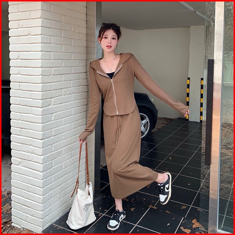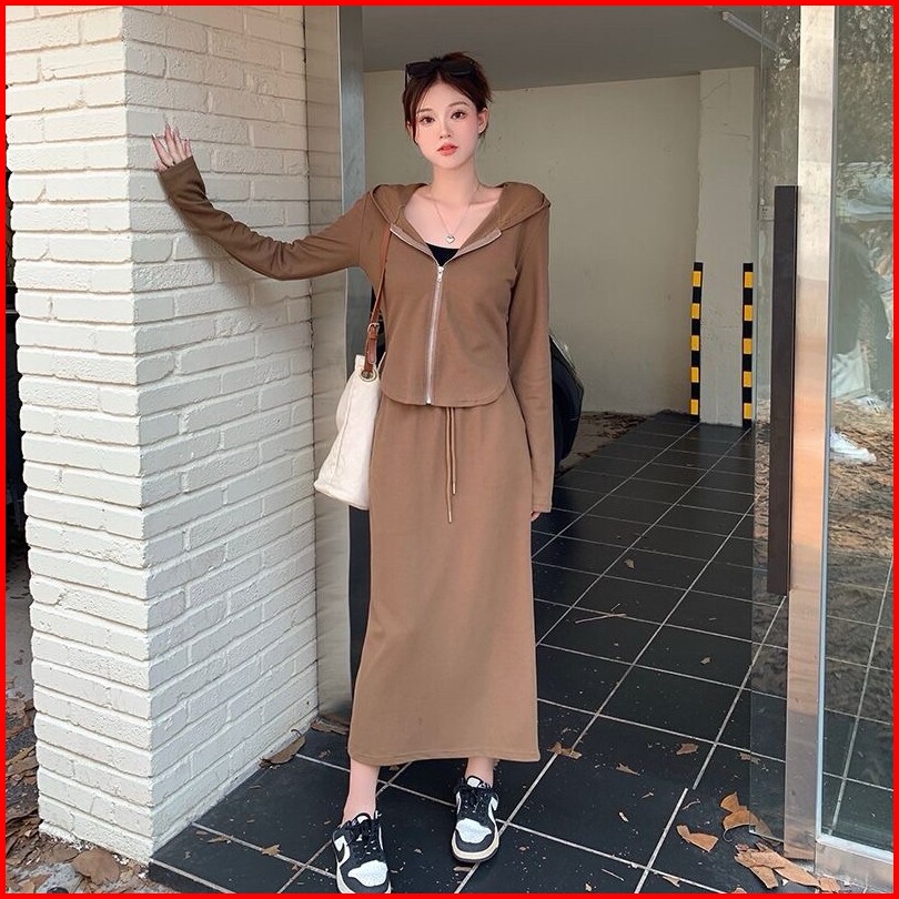Haruka One Set Skirt Hoodie Zipper Crop Vintage Korean Style