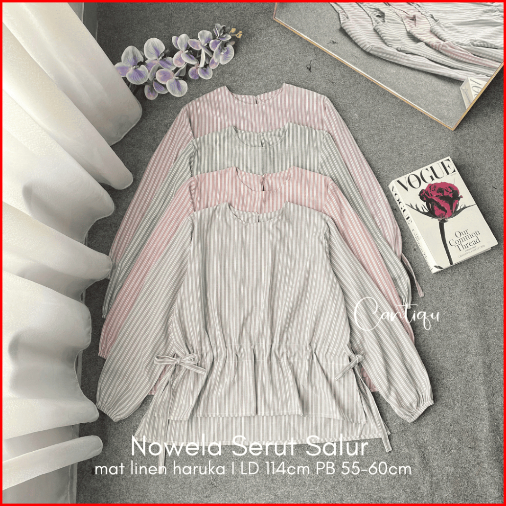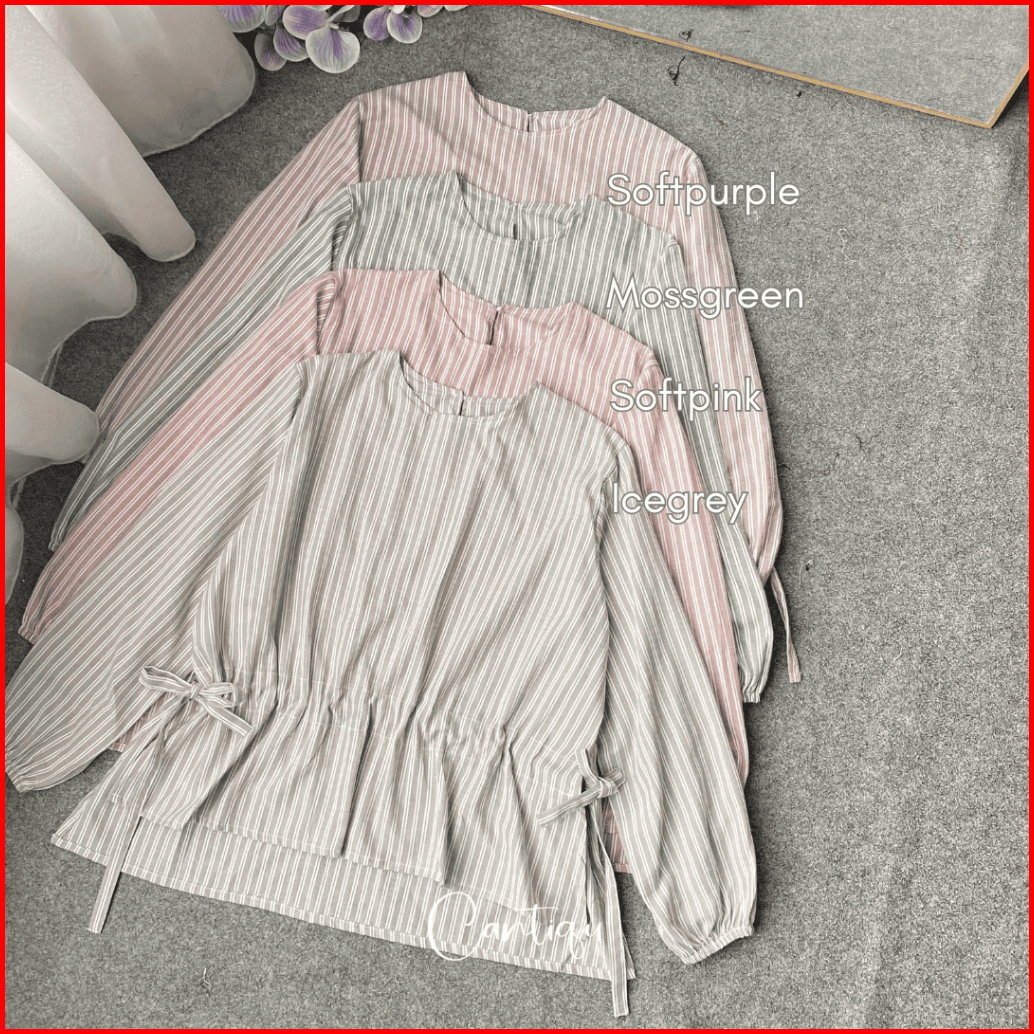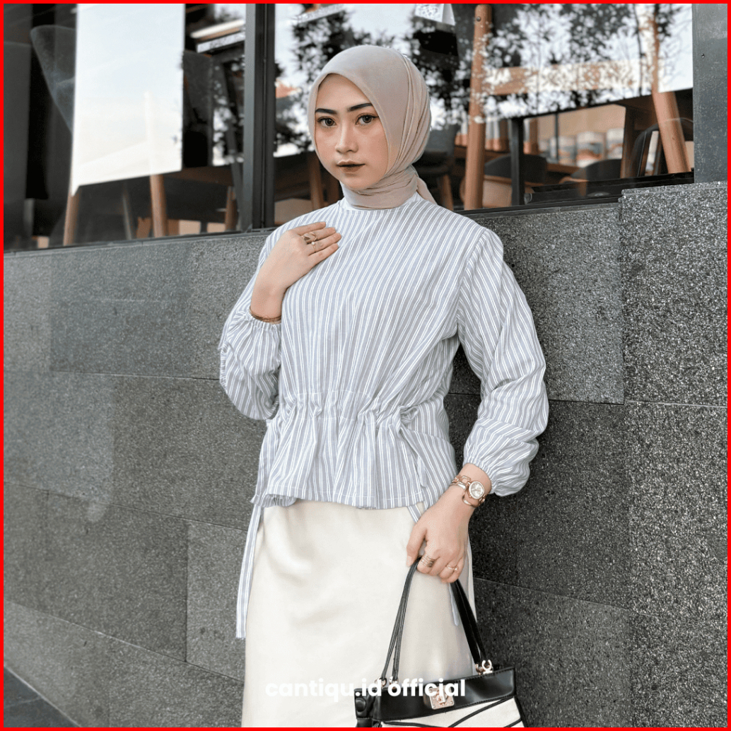 Cantiqu - Nowela Blouse Serut Salur Lengan Panjang Bahan Linen