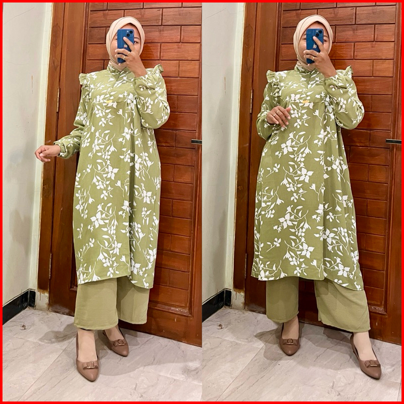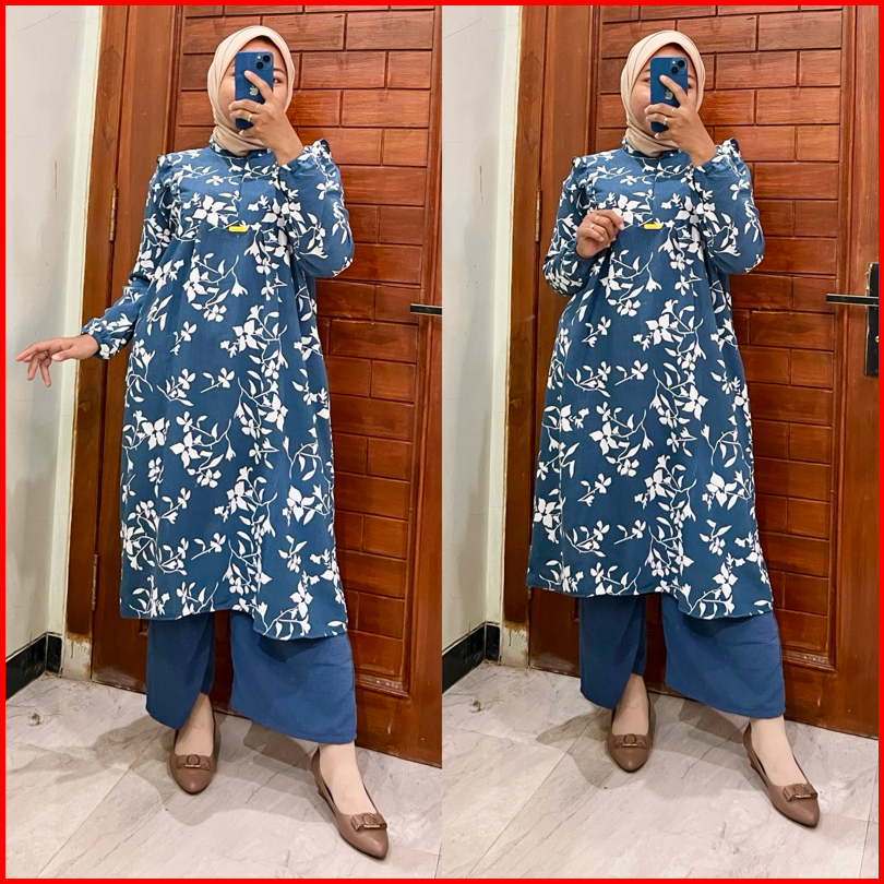 Maygrosir.id One Set Tunik Kulot Bunga Putih Setelan Baju Wanita Muslim Kekinian Crinkle Airflow