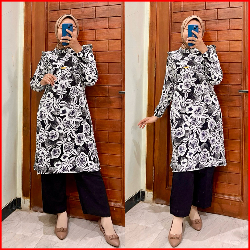 Maygrosir.id One Set Tunik Kulot Mawar Setelan Baju Wanita Muslim Crinkle Airflow Lengan Panjang