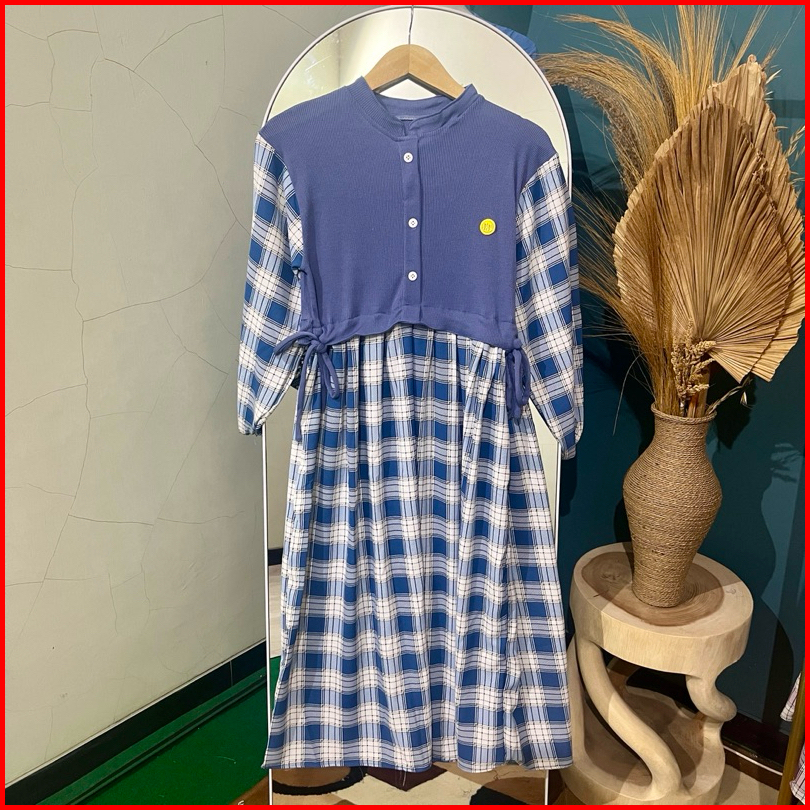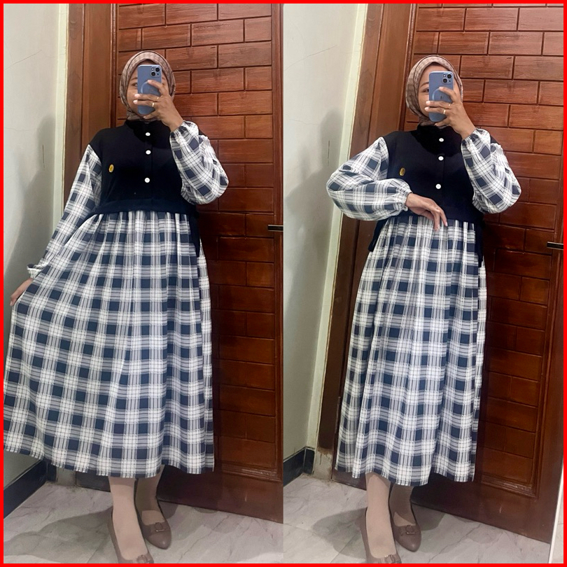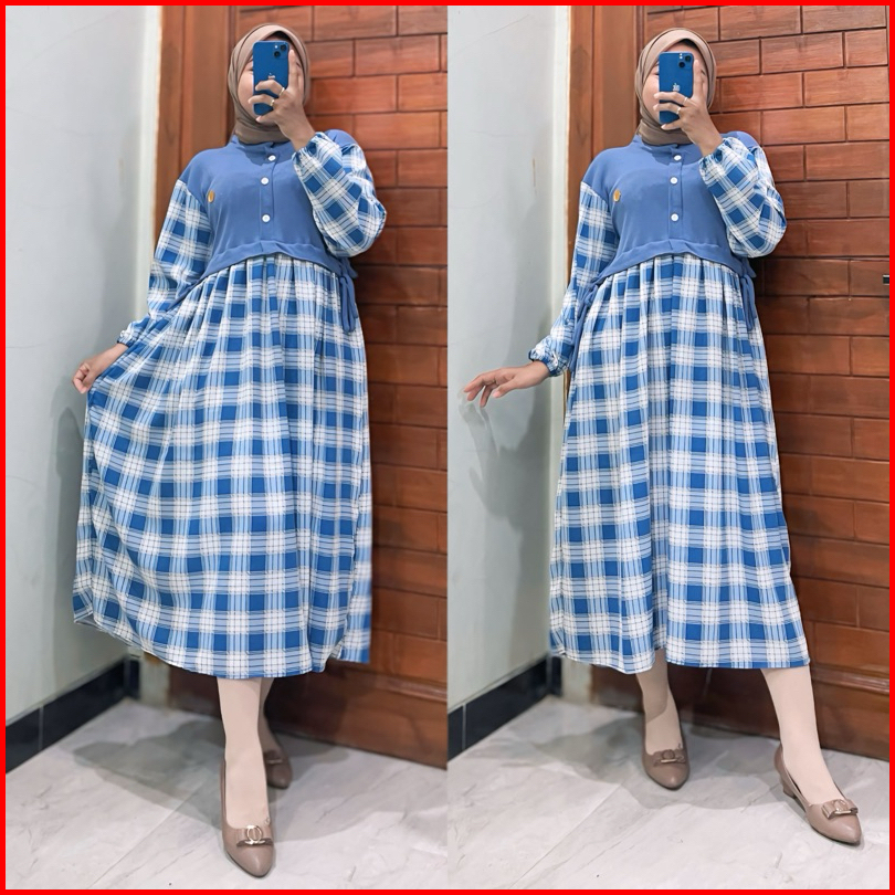 Maygrosir.id Monalisa Midi Dress Baju Gamis Wanita Crinkle Airflow Premium Muslim Motif Kotak