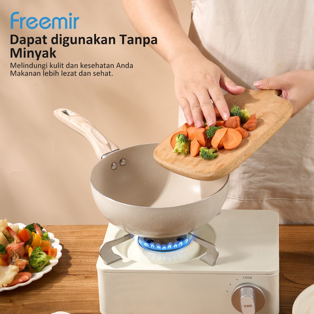 Get Store Special freemir Wokpan Anti Lengket 20cm Wajan Penggorengan Beige Dengan Gagang Serat Kayu 1.8L/2.0L
