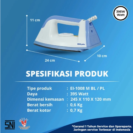 Setrika Miyako 395 Watt Gosokan Anti lengket EI1008MBK - MBL - MPL
