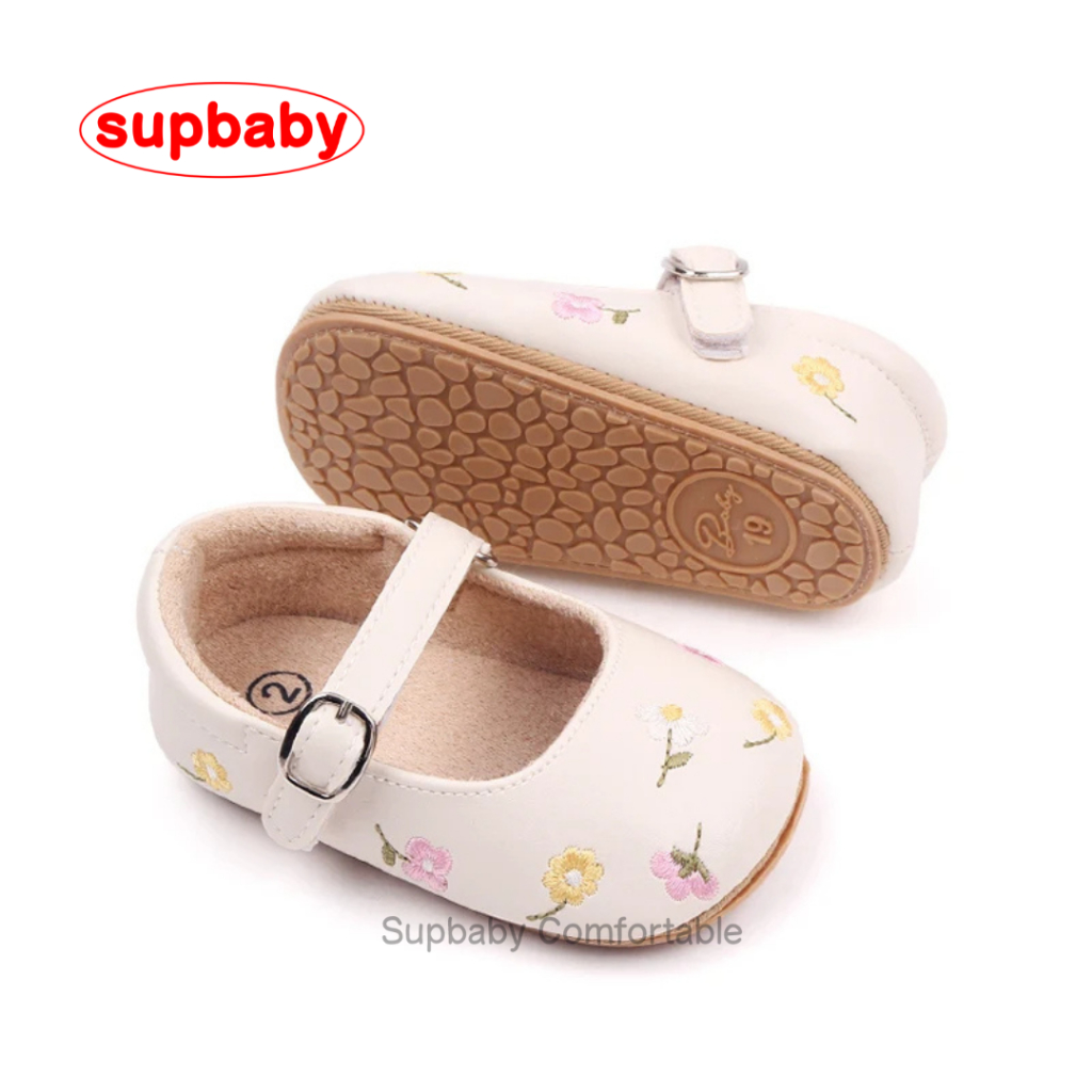 Sepatu Bayi Perempuan Embroidery Flower Usia 0 - 12 Bulan Anti Slip, Sepatu Bayi Perempuan Lucu