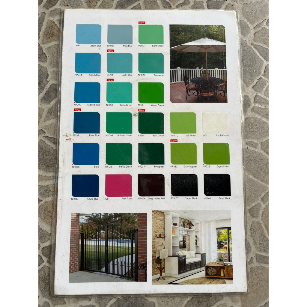 BS9103 Super Black, BS9102 Super White, NP666 Matt Black, NP66 Matt White, 1001 Putih Kental, BS4053 Primrose, 1015 Ivory Lace, BS3040 Straw Cream, 1013 Genuine Yellow, NP900 Canary Yellow, 868M Honey Wood, NP824 Dover Grey, 828M Mayan Yellow, NP803 en Yellow, 723M Honey, NP06 Candy Brown, BS3044 Saddle Tan, 815 Silver, NP117 Lemon Yellow, NP603 Nassau Orange, 925M Damar, 984M Merah Bata, 852M Grey, 1018 Sunshine, NP601 I. Orange, NP083 Leaf Brown, 1016 Titan Brown, NP823 Aircraft Grey, NP445 Lemon, NP600 Vermillion, 707M Dark Brown, NP084 Liver Brown, NP822 Lead, 1011 Dream Blue, NP028 Mist Blue, 989M Light Green, NP044 French Blue, 847M Lucky Blue, NP020 Turquoise, NP099 Atlantic Blue, NP081 Pelita Green, 1010 Warm Green, 132M River Blue, NP098 B. Green, 859M Fast Green, 1014 Soft Green, NP066 Blue, NP123 Traffic Green, NP239 Evergreen, NP882 Grasshopper, NP222 Crystal Mint, NP067 Azure Blue, 105 Pink Flare, NP406 D. Indian Red