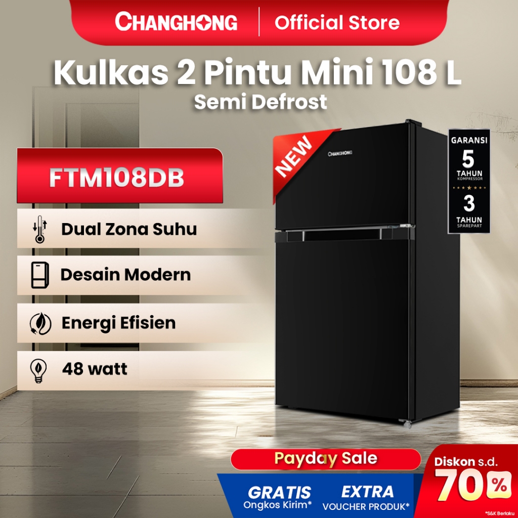 [READY STOCK] New Changhong Kulkas 2 pintu Mini (Refrigerator) Lemari Es Kapasitas 108 Liter – Black FTM108DB (Semi Defr