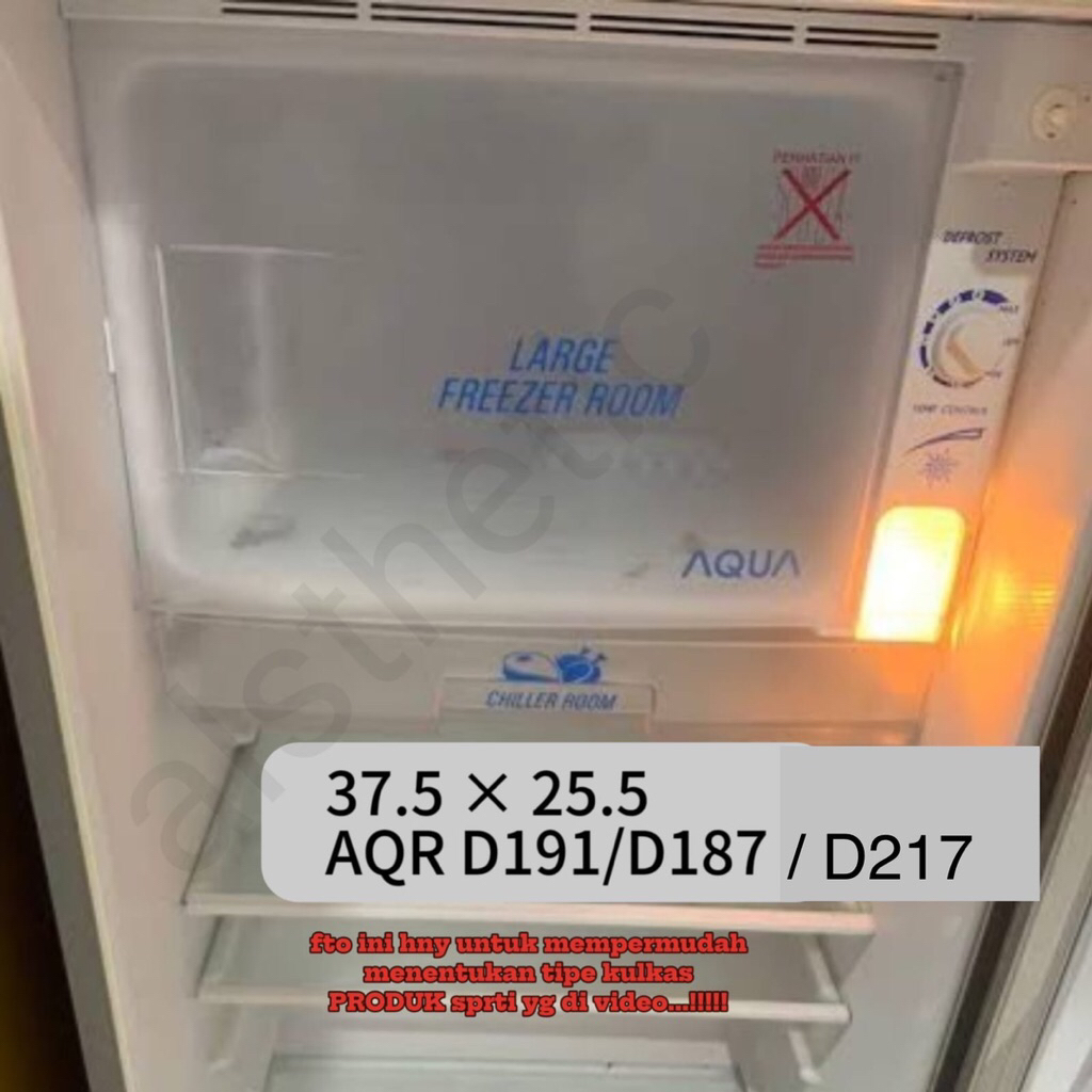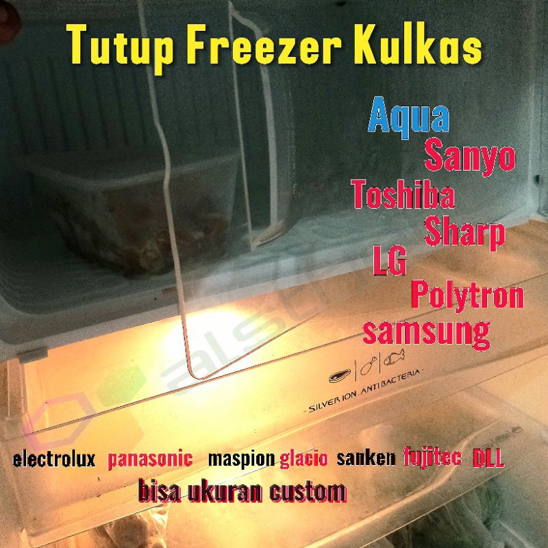 Aqua jumbo, Aqua kecil, LG expresscool, LG new, Sanyo slim, Sanyo ruby, Sanyo emerald, Toshiba jumbo, Toshiba kecil, Glacio jazz/grand, Sharp nice crystal, Sharp double freezer, Sharp extra large, Sharp lemon, Sharp new, Polytron PR 18, Polytron PR15_16_17, Fujitec jumbo, Fujitec kecil, Samsung, Panasonic, Maspion, Electrolux, Kecil, Ukuran custom