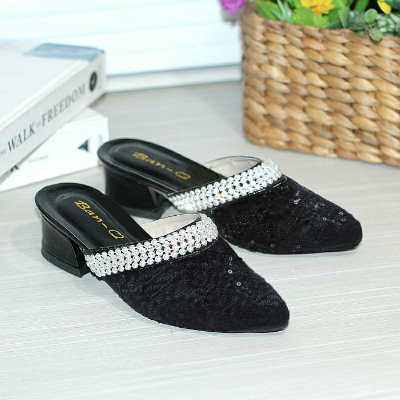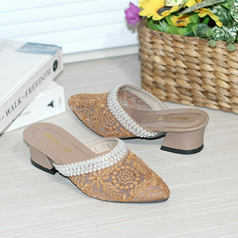Sepatu Sandal Pesta Anak Perempuan Hak Tahu Selop Brukat Jala Mutiara Kitten Heels ||IR48||