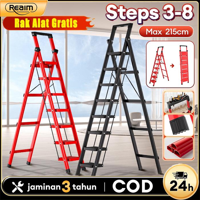 50%REAIM Tangga Lipat Baja Karbon 300KG 3/4/5/6/7/8 Langkah Tangga Lipat Multifungsi dan Multiwarna