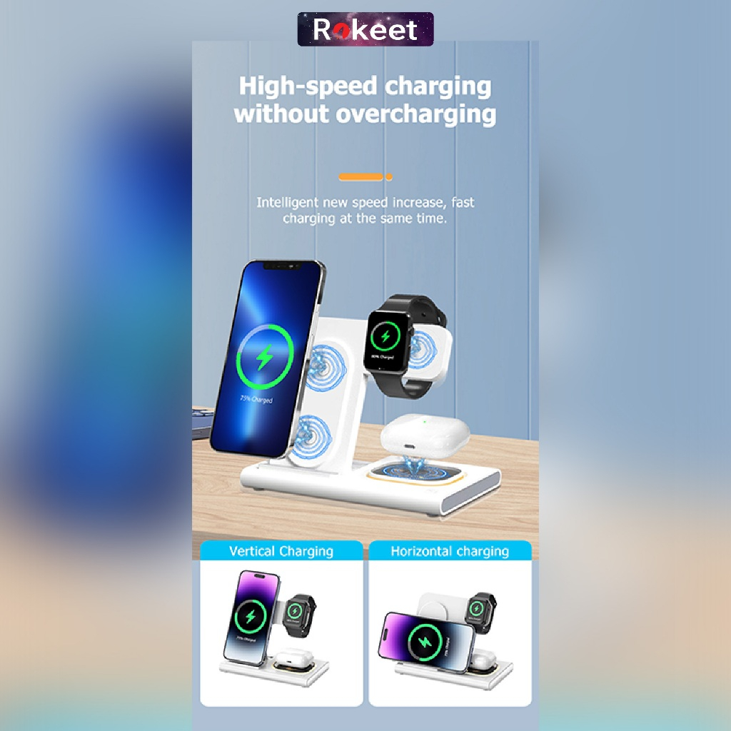 Rokeet Wireless Charger Foldable 4 In 1 Magnetic Magsafe Fast Charging Stand Dock Phone Portable For IOS Android