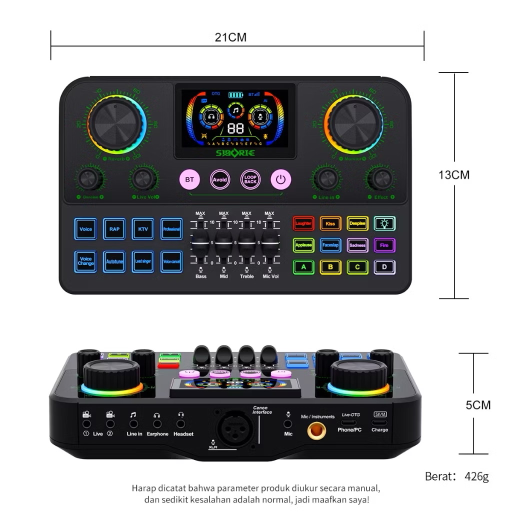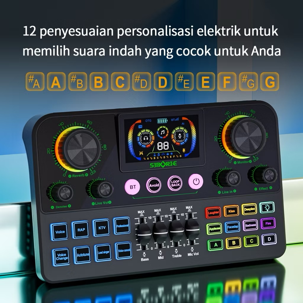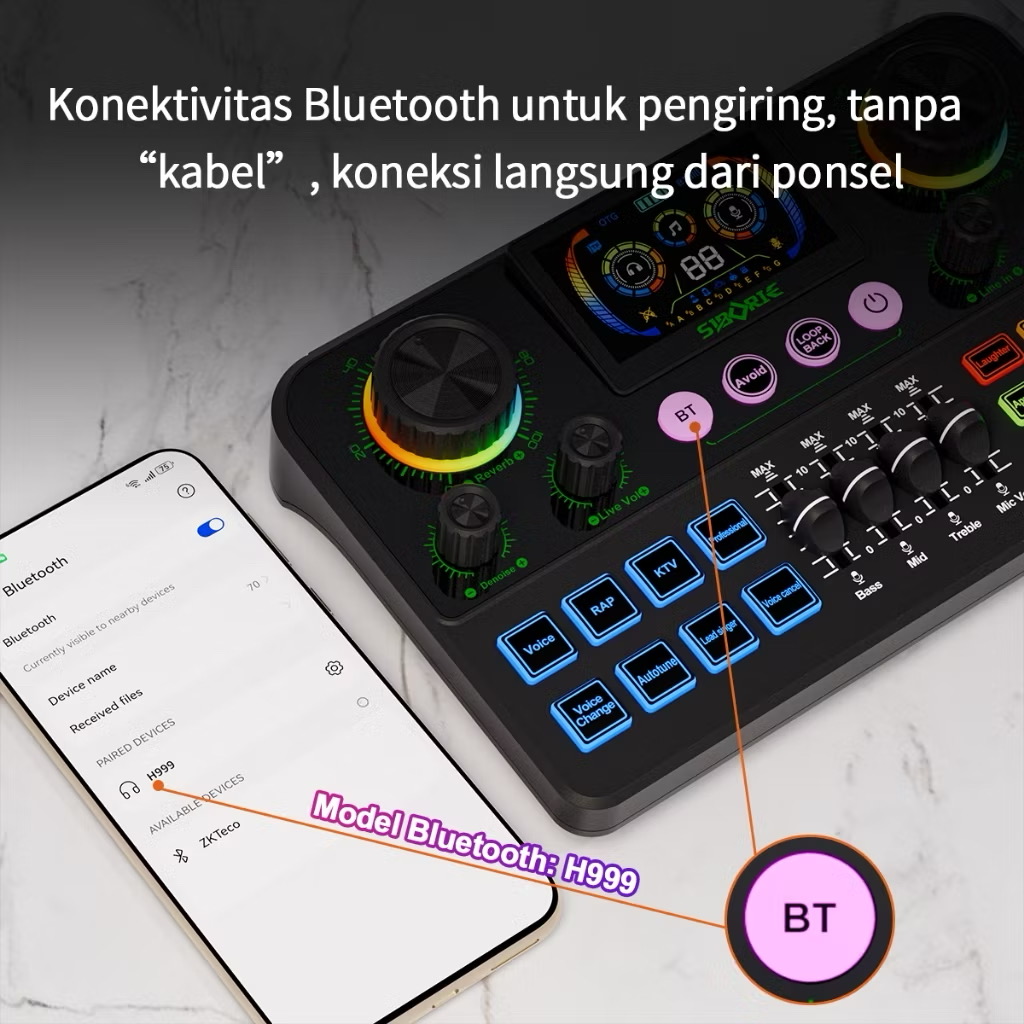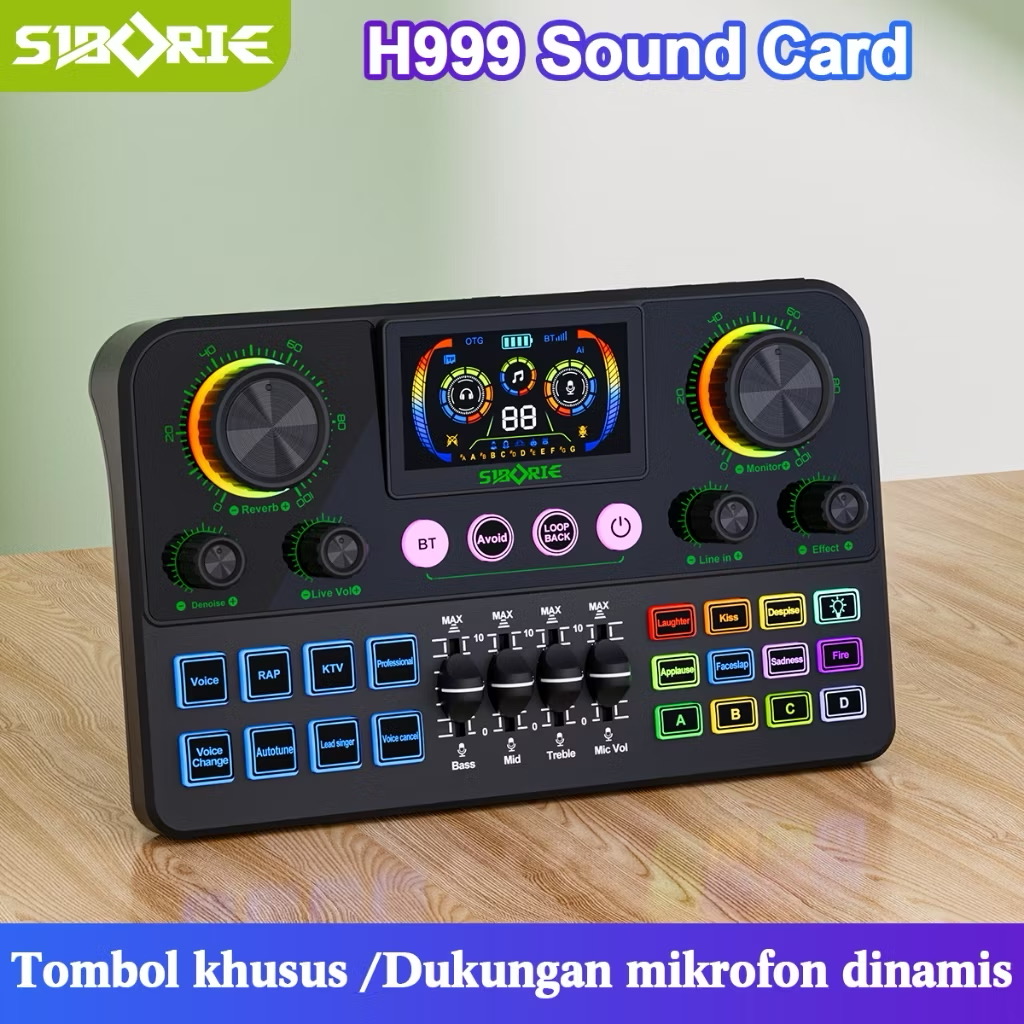 Siborie H999 Soundcard Bluetooth dengan Mixer Langsung, Layar, dan Efek Pencahayaan RGB, Cocok untuk Pertunjukan