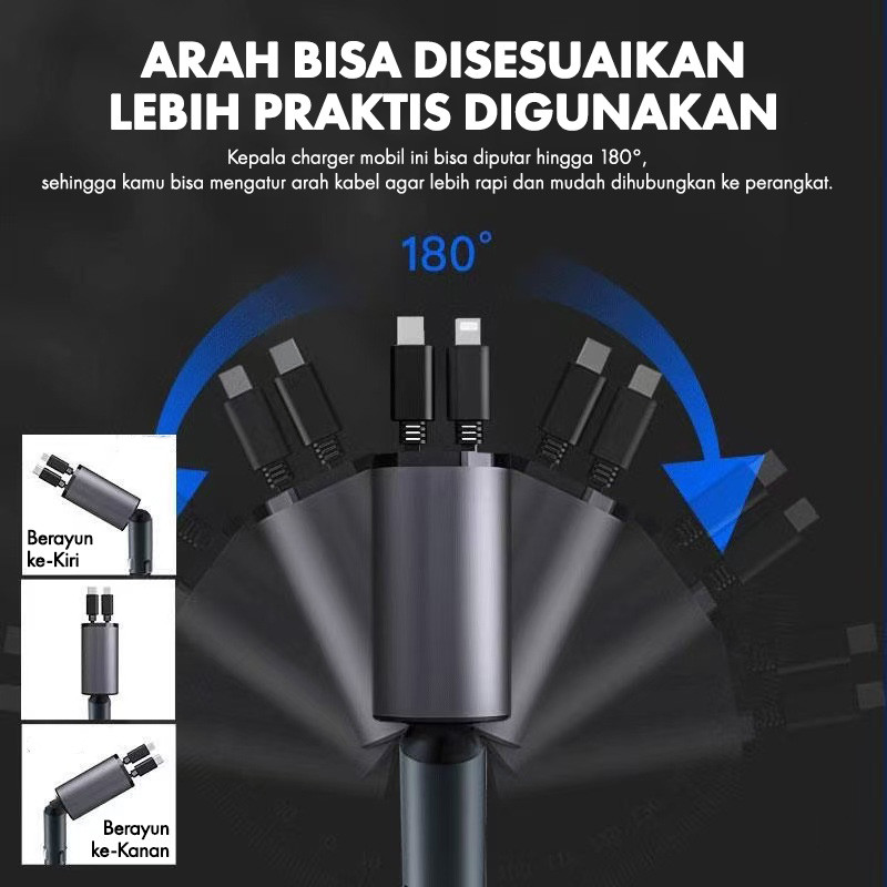 Smarteck Retractable Cable Car Charger SCH02 Colokan Mobil 4 Ports USB IOS Type C Lightning 4in1 Pengisian Cepat 120W Fa