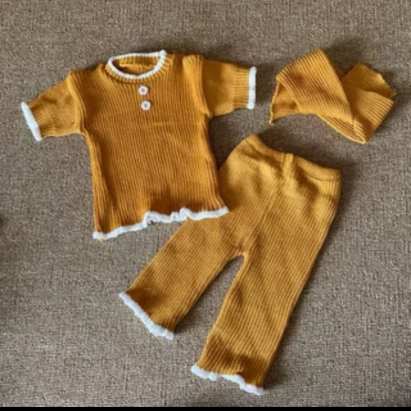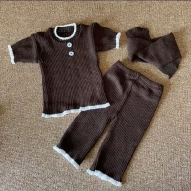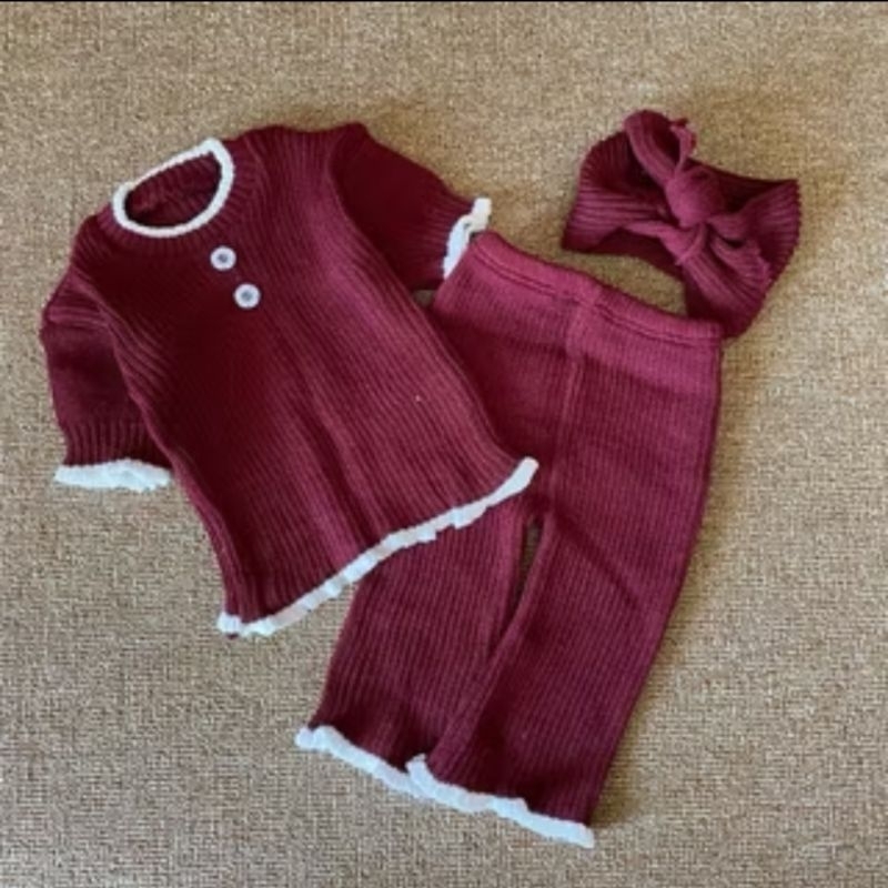 set rajut bayi 3in1 baju celana dan bandana bahan rajut