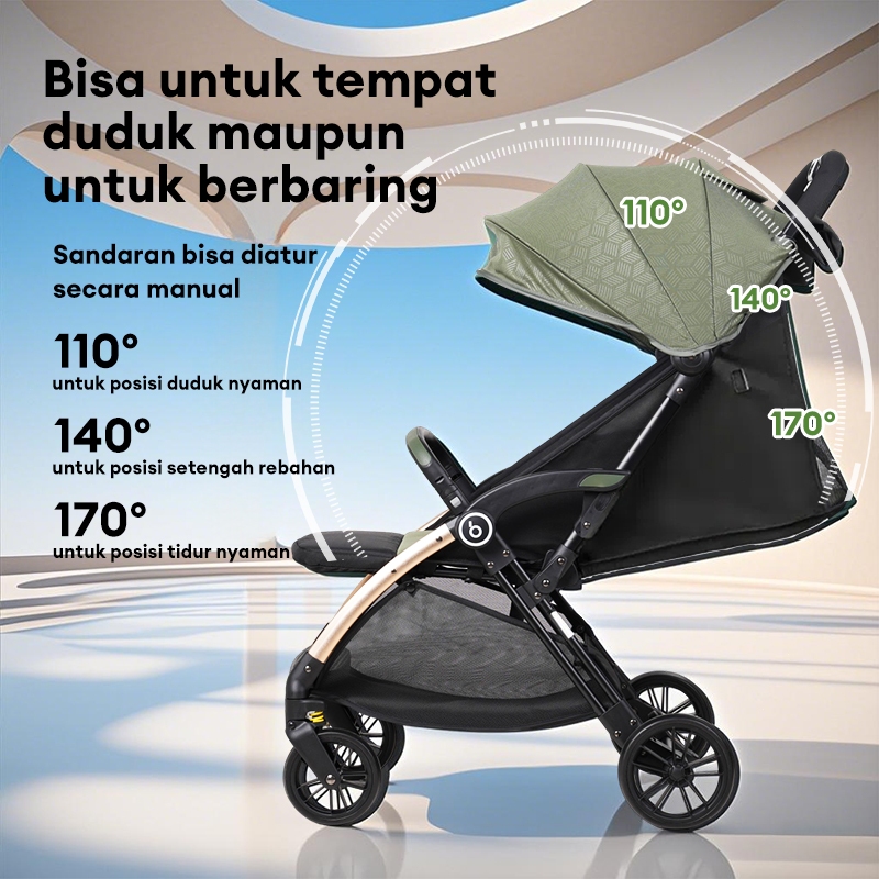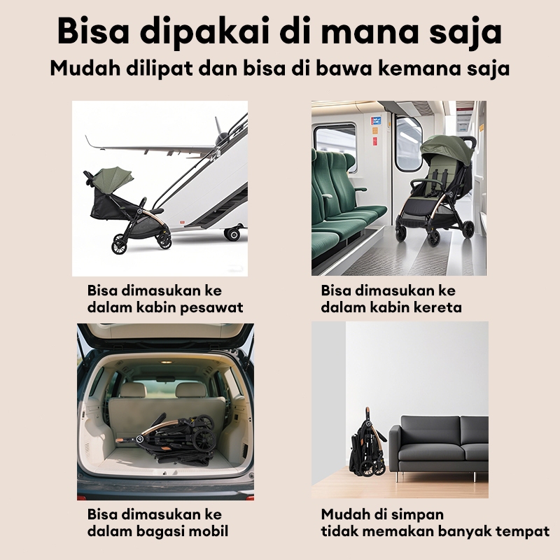 BEIGE Stroller Bayi AutoFold Portabel, Bisa Tidur Nyaman Kapasitas Max 100kg Stroller Traveling
