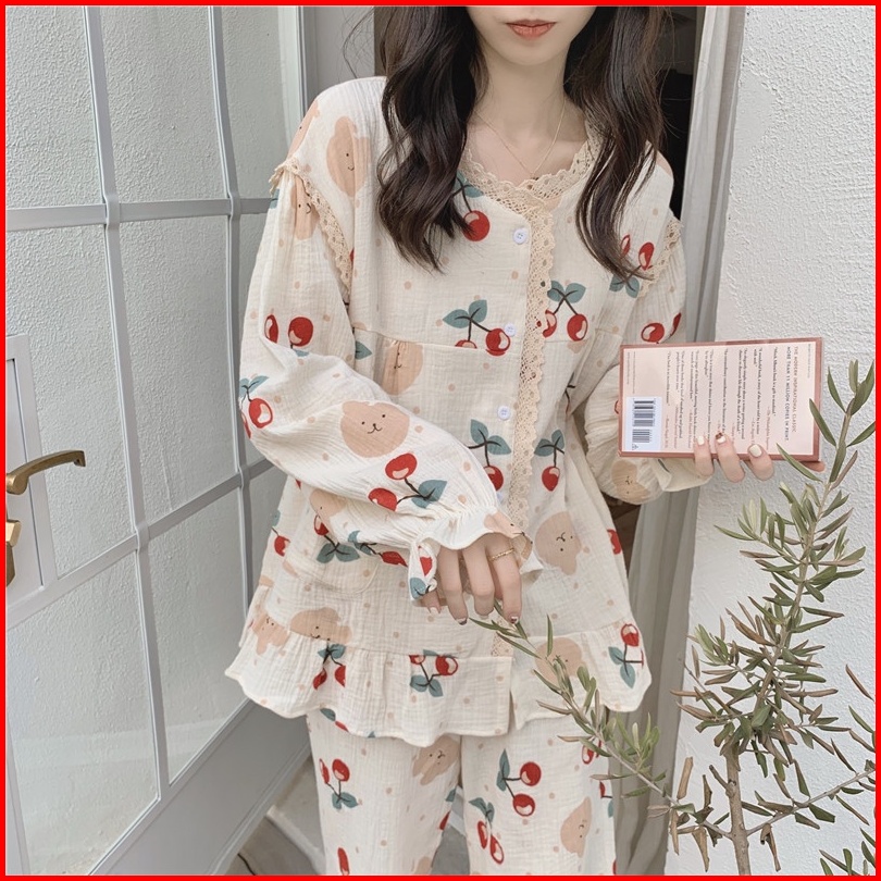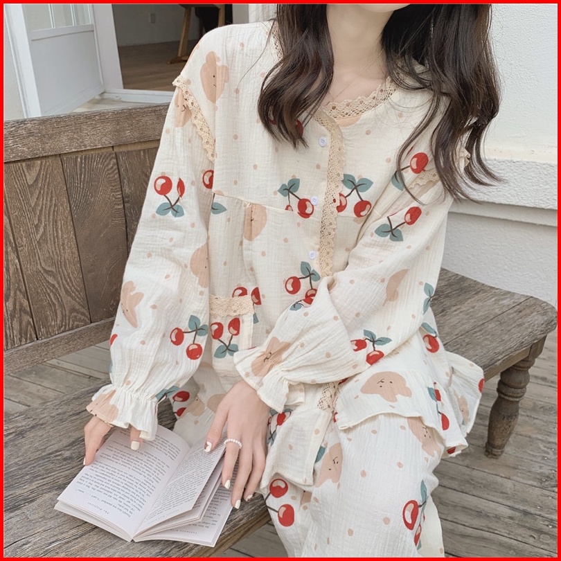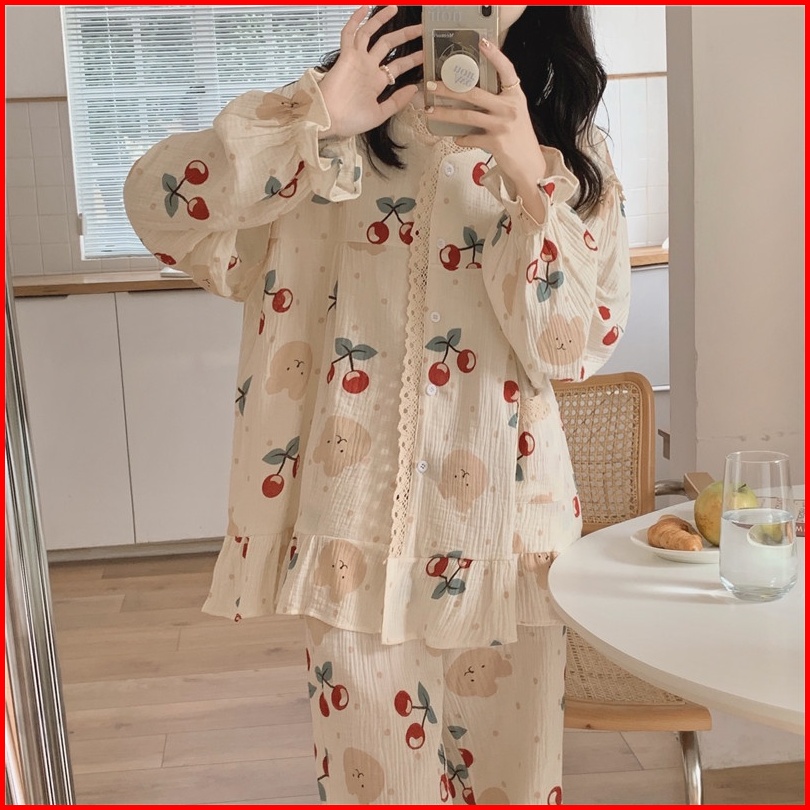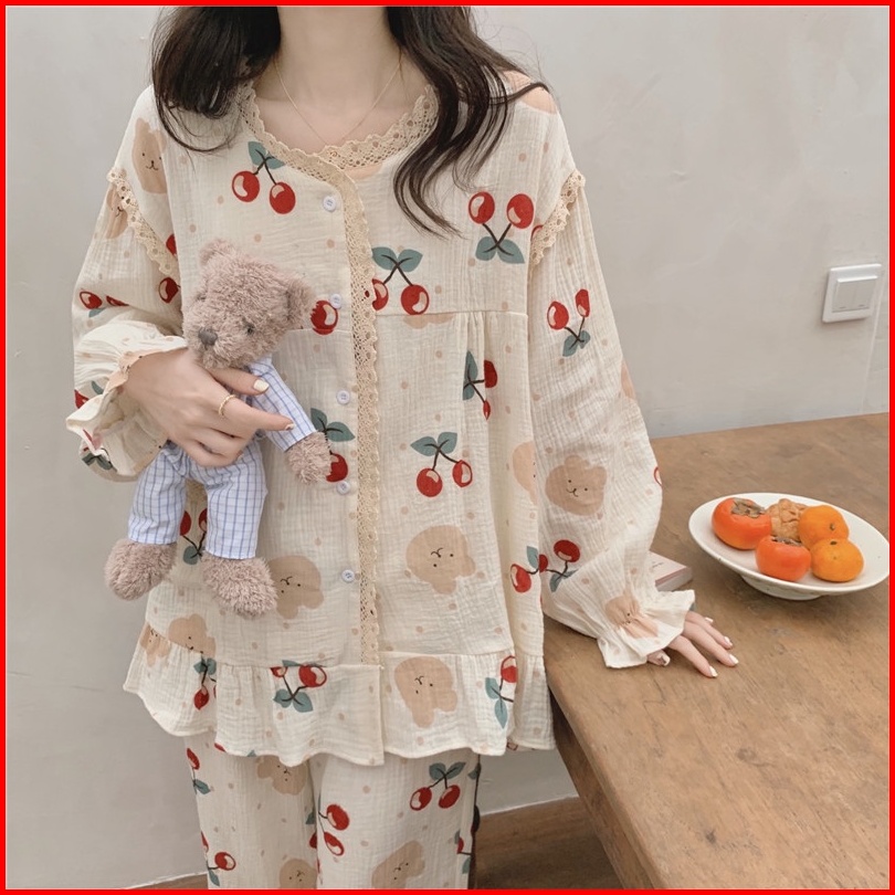Cherry Teddy Long Pajamas - Dream Tales Sleepwear - Piyama Wanita Katun Korea
