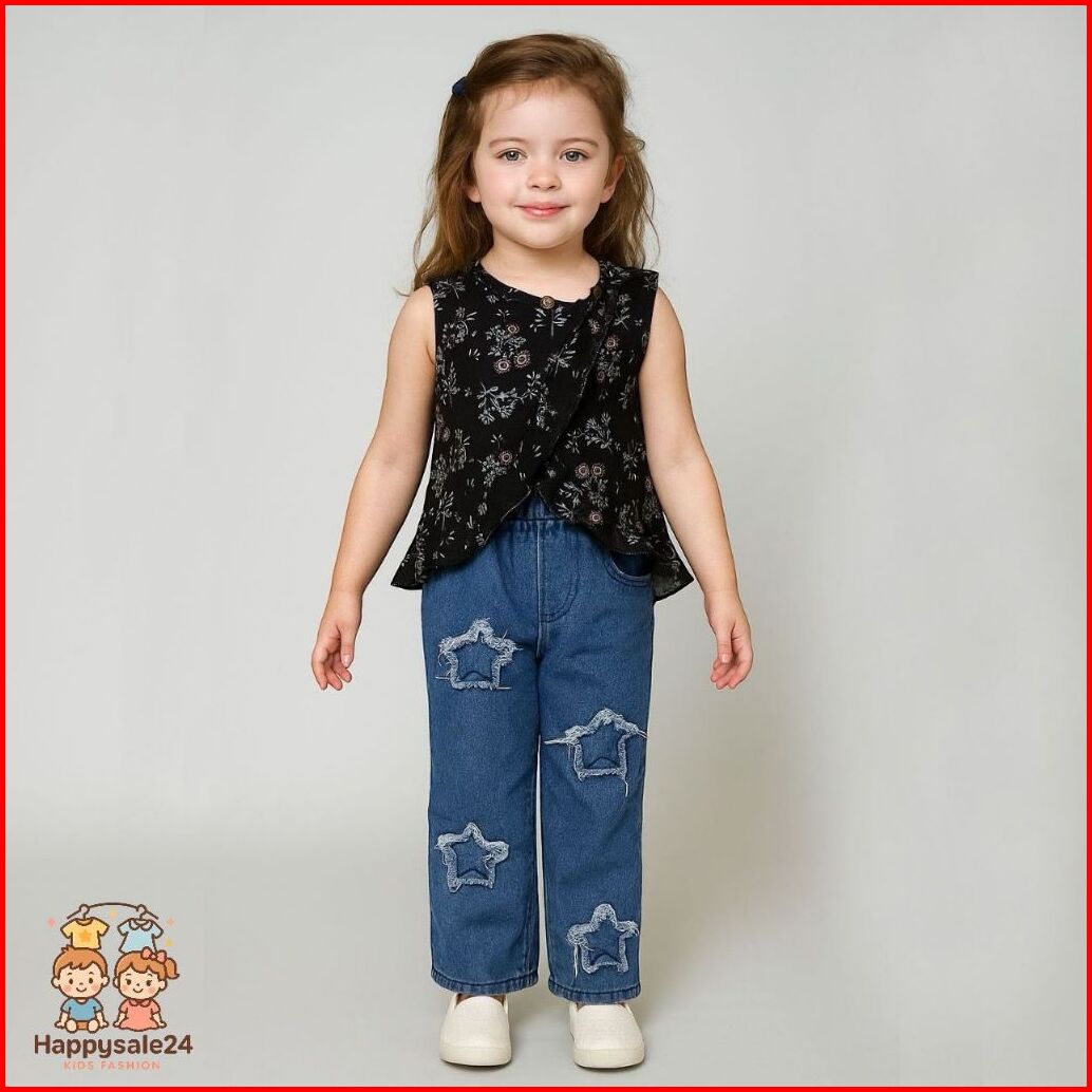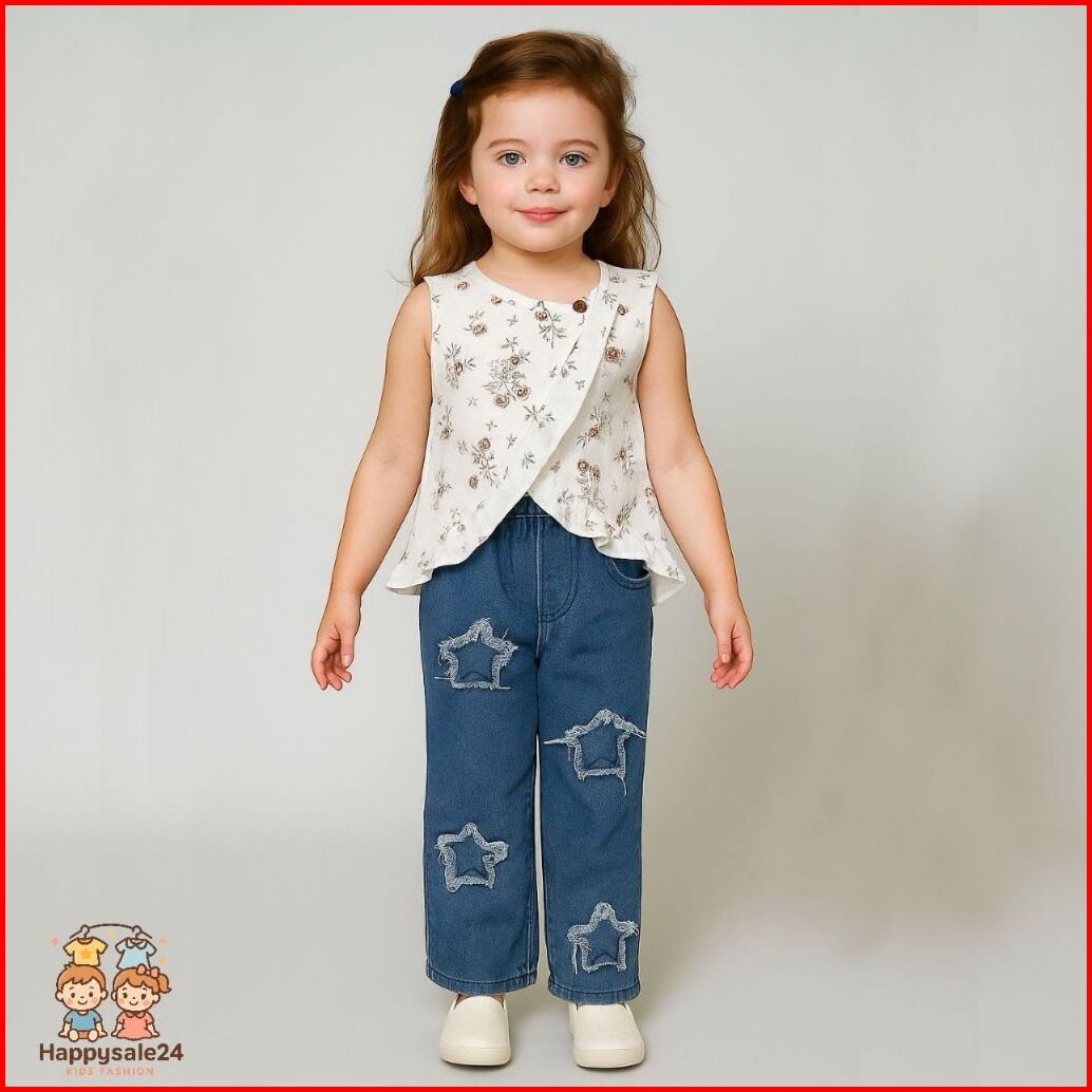 Setelan Baju Anak Perempuan Lucu Usia 1-5 Tahun Atasan Motif Bunga Dan Celana Jeans Bintang Baju Anak Kekinian Setelan A