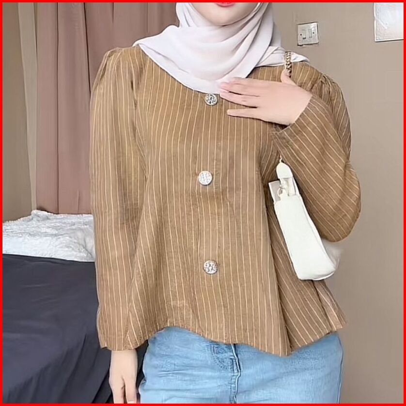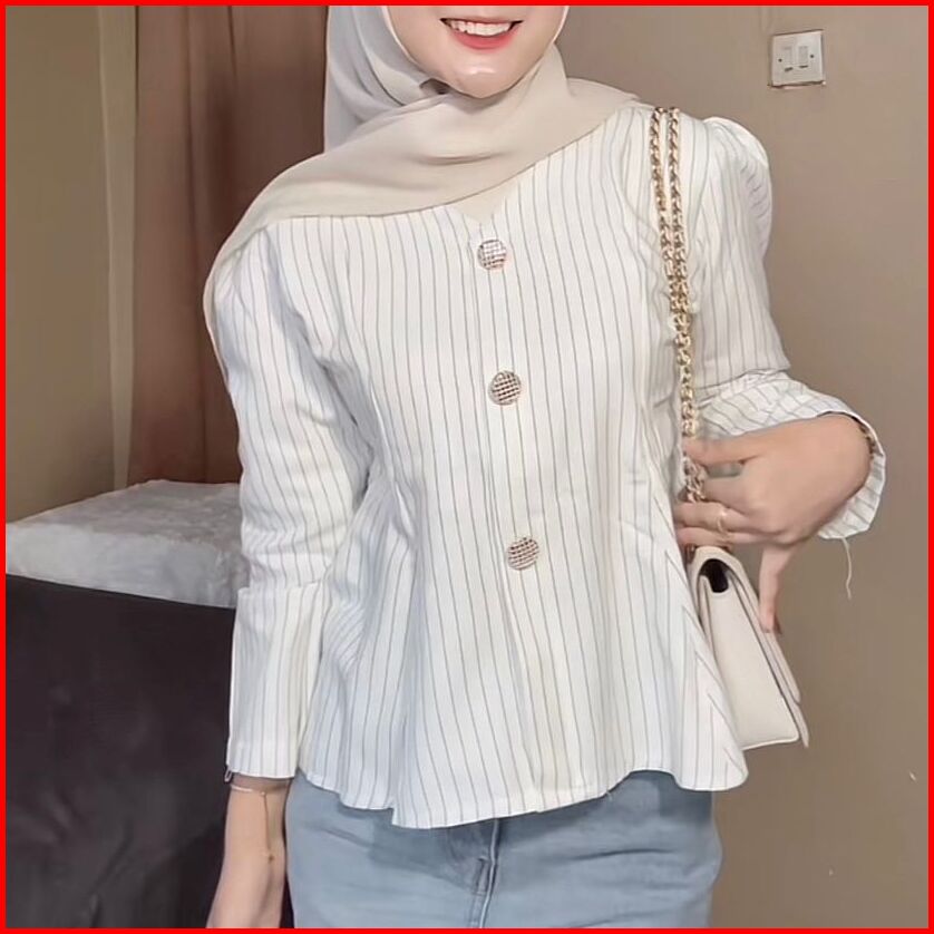 Lbitz- Arika Blouse Stripe Atasan Wanita Peplum Blouse Lengan Puff Salur Lengan Panjang