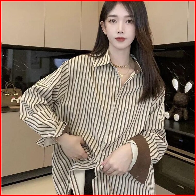 Kemeja Stripe Oversize Atasan Wanita Lengan Panjang W295 Korean Retro Style Loose Stripe Shirt For Women Long Sleeve Gir