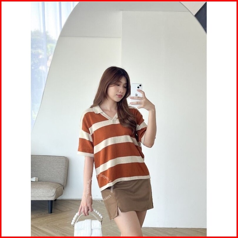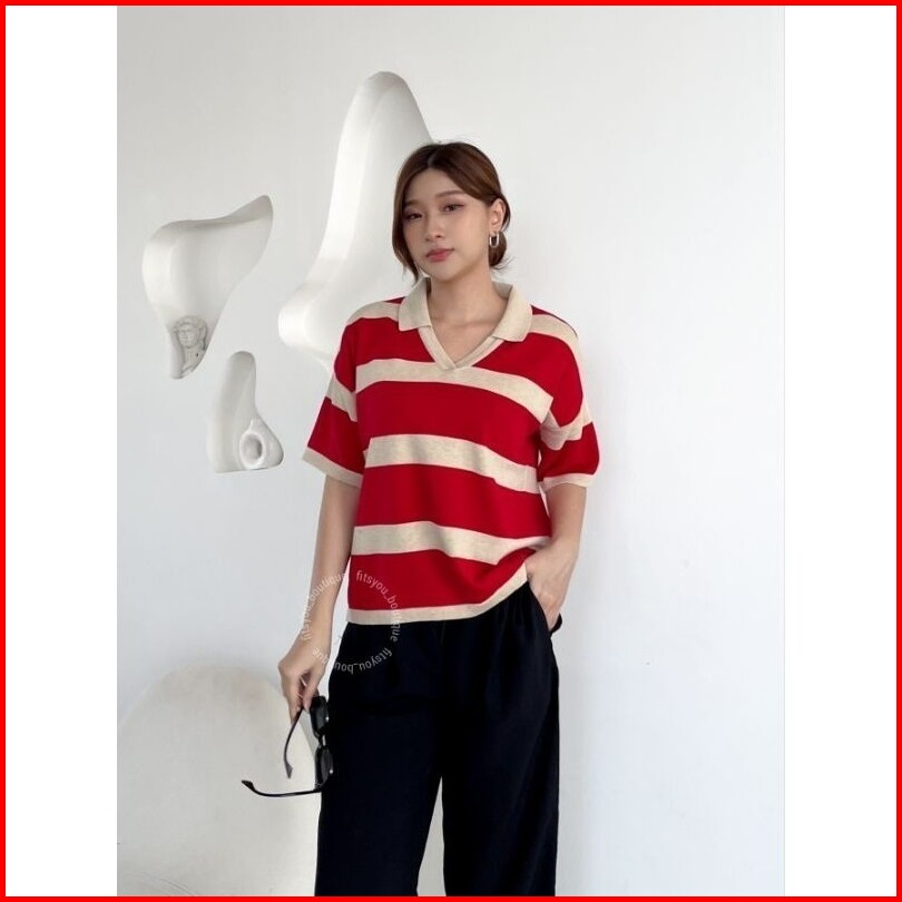 Jasmine Knit Tops Baju Atasan Rajut Wanita Katun Halus Adem Tangan Pendek Kerah Garis