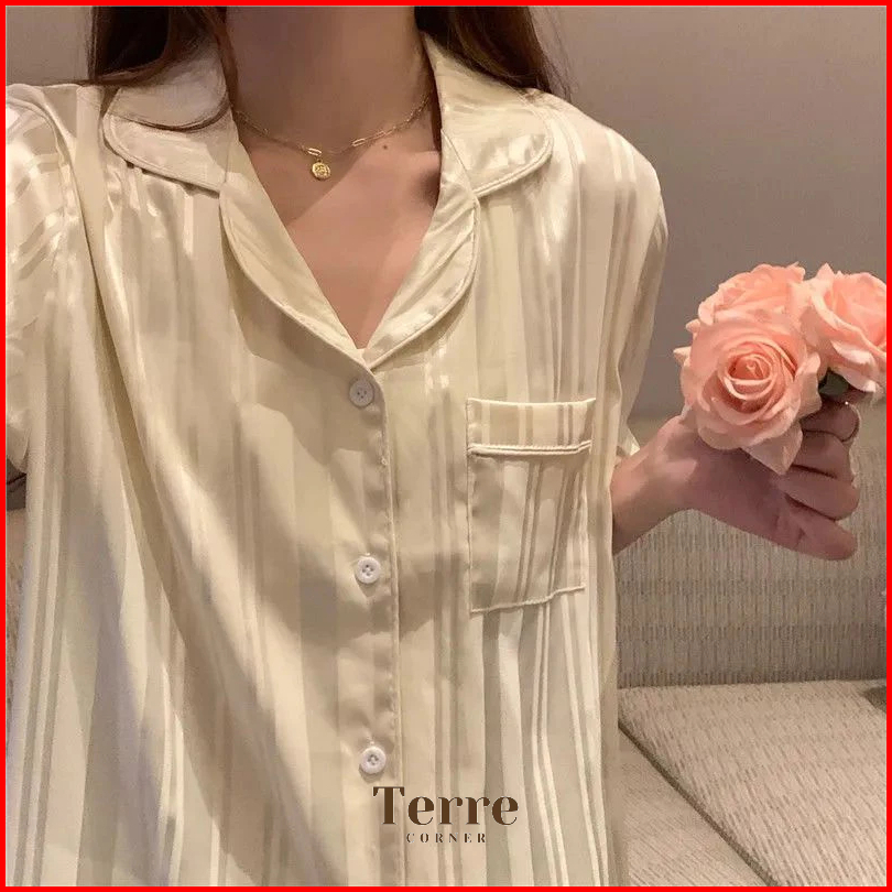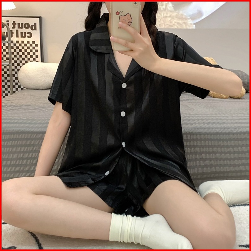 Baju Tidur Wanita Dewasa Kyara Short Sleepwear Piyama Set Satin Silk Setelan Garis Warna Polos Pakaian Tidur Lengan Pend