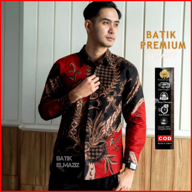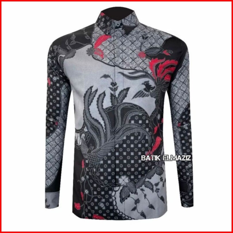 Batik Elmaziz Motif Mahasemeru Hitam Putih Hem Atasan Kemeja Baju Batik Pria Cowok Laki Laki Slimfit Full Kancing Printi