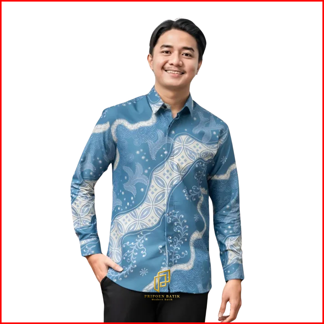 Pripoen Batik Kemeja Batik Pria Motif Abinawa Biru Batik Pria Lengan Panjang