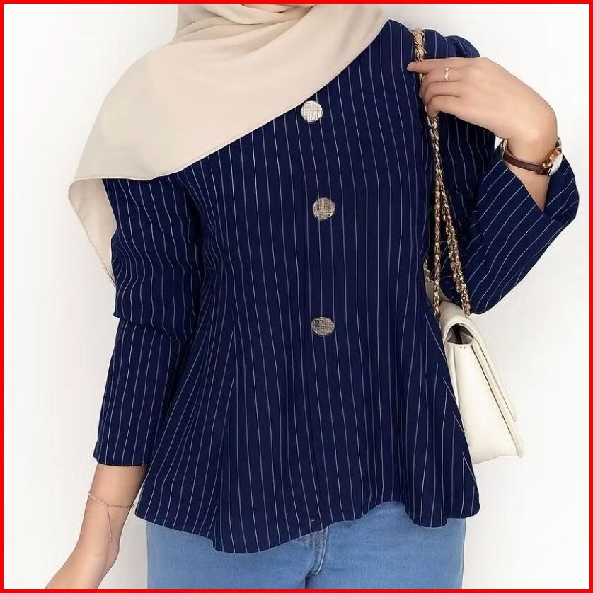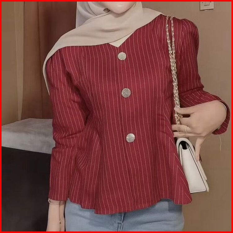 Elezza- Arika Blouse Stripe Atasan Wanita Peplum Lengan Panjang Puff Fit Body Fitted