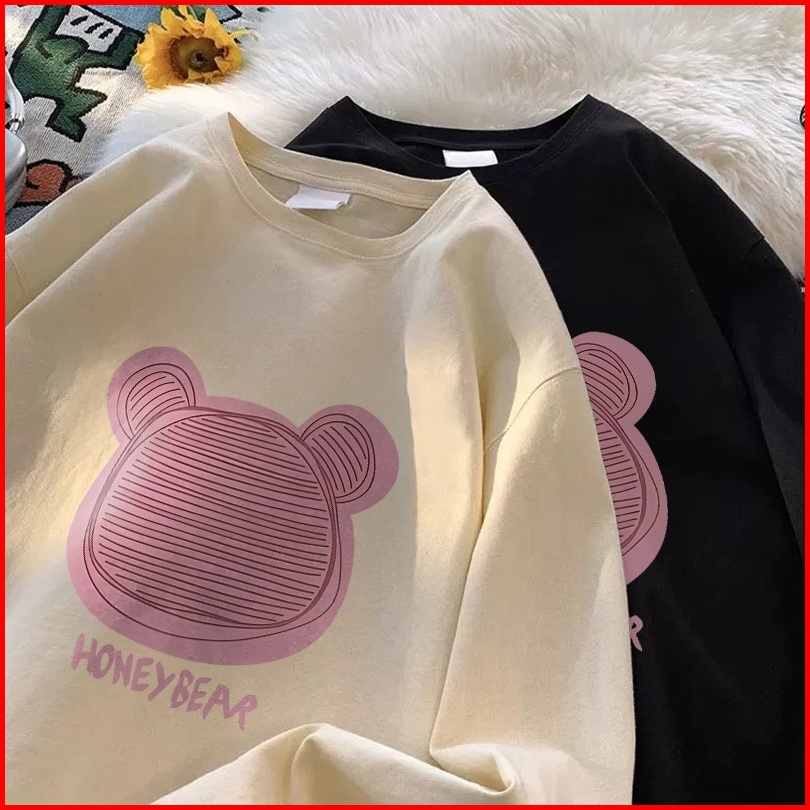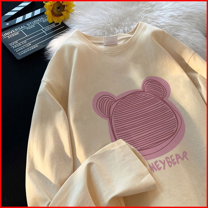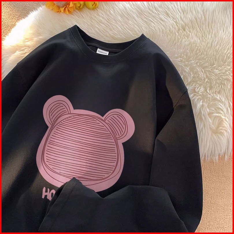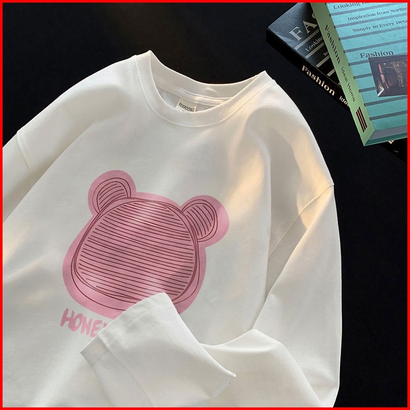 Forteid Atasan Kaos Wanita Oversize Lengan Panjang Korean Style Beruang Lucu Berwarna Merah Muda Lucu Baju Kaos Polos Co