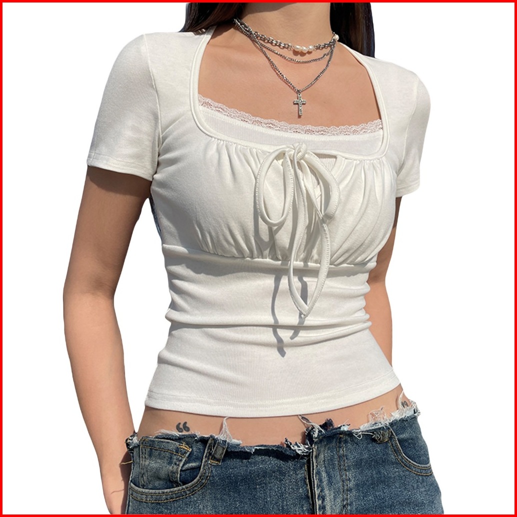 Heysoul Baju Coquette Style Wanita - Atasan Crop Top Lengan Pendek Square Neck Pita Dada Kekinian