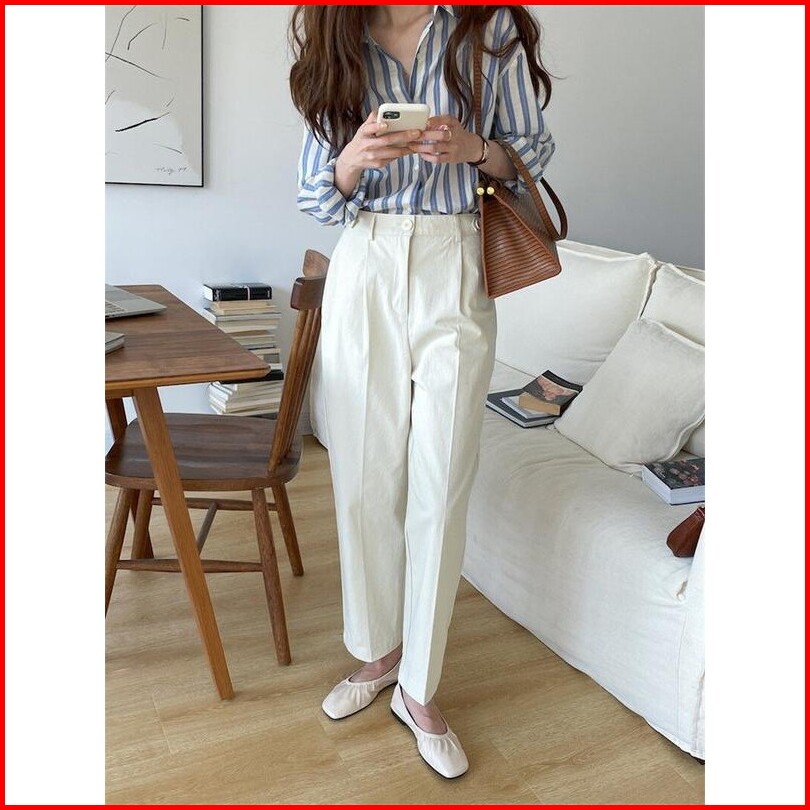 Feminafashion W390 Kemeja Salur Lengan Panjang Kasual Untuk Ngantor Gaya Perancis Elegan Retno