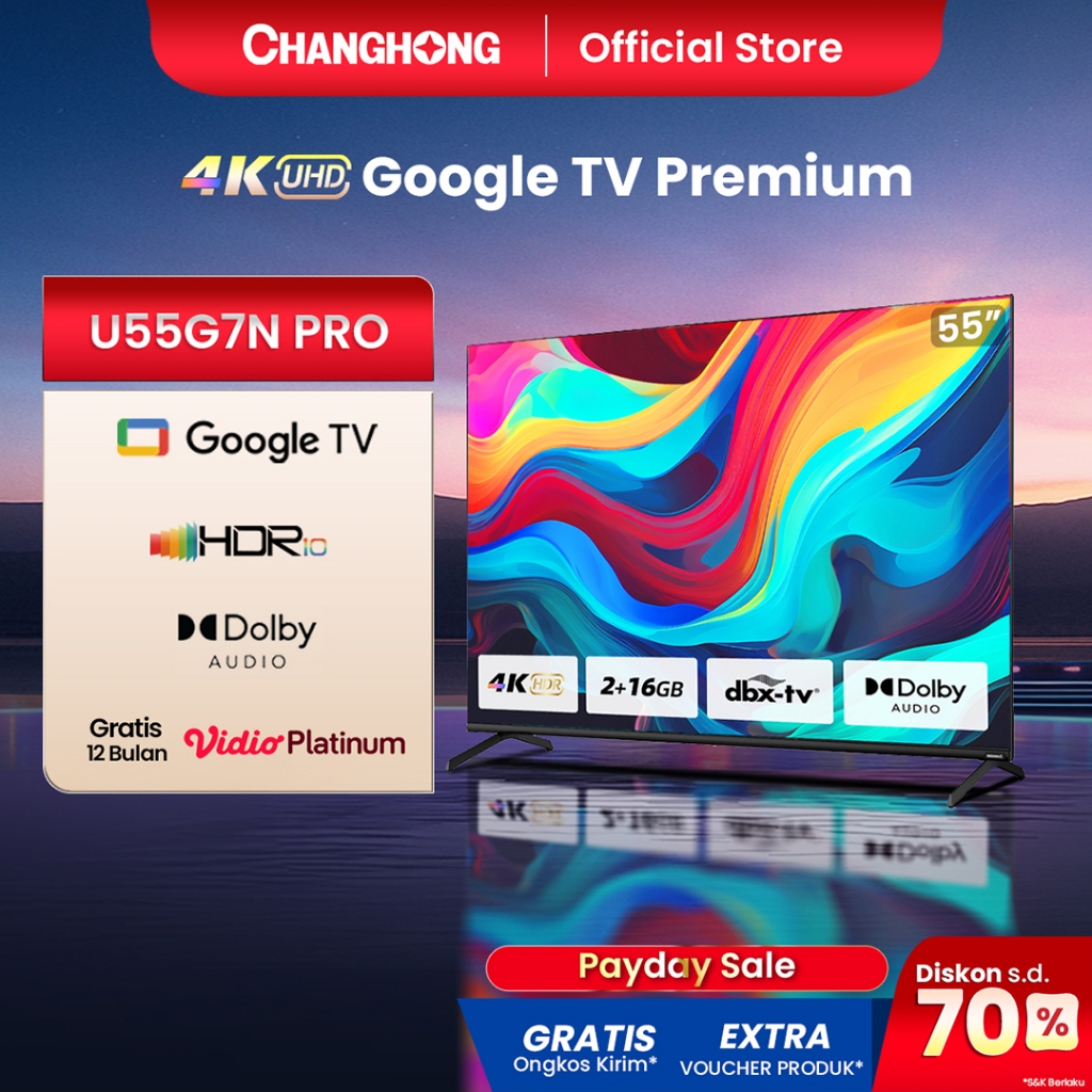 TV Changhong 55 inch Smart TV 4K UHD-HDR10 DBX Dolby Audio Google Assistant Netflix Youtube Digital TV (U55G7N Pro)